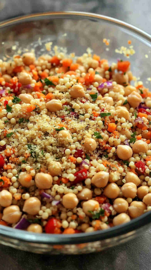 This vibrant Quinoa and Chickpea Salad combines fluffy quinoa, hearty chickpeas, crisp cucumber, juicy cherry tomatoes, red onion, fresh parsley, and mint, all tossed in a creamy, tangy lemon-tahini dressing. It’s a refreshing, plant-based meal full of texture, bright Mediterranean flavors, and satisfying protein—ideal for meal prep or summer gatherings.