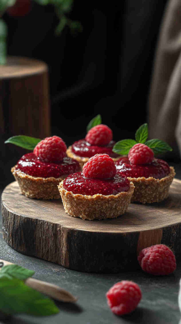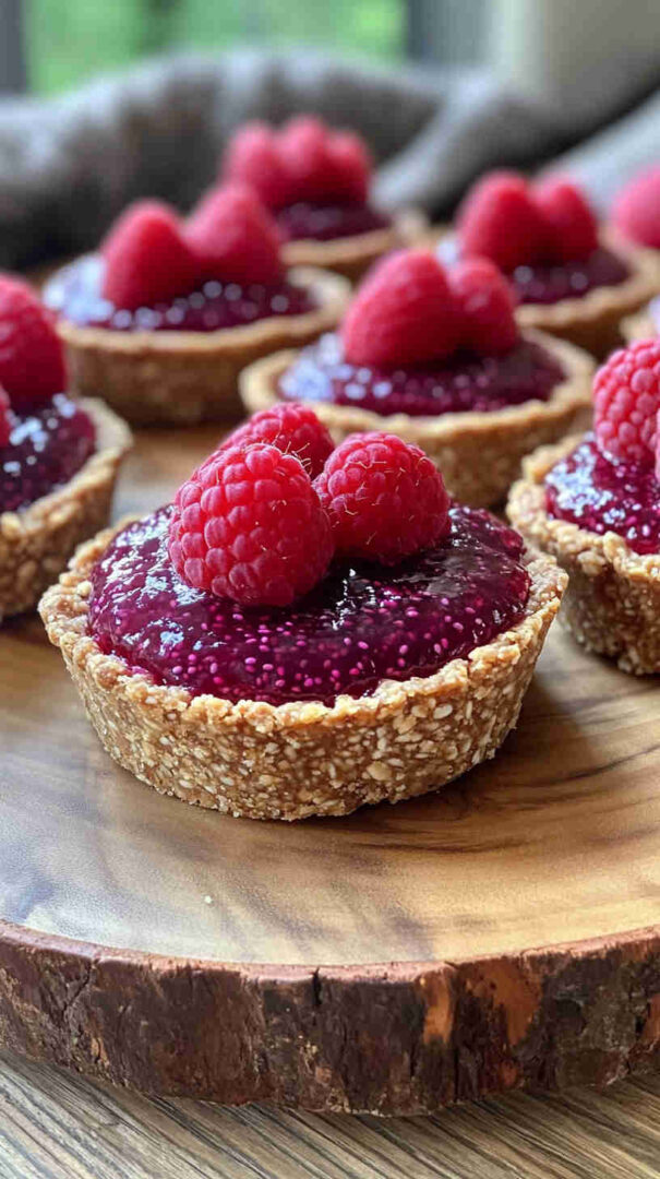 Mini healthy tartlets with nutty crust and naturally sweetened raspberry chia jam—easy, vegan, gluten-free delight!