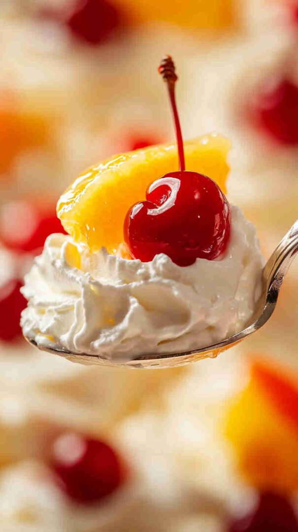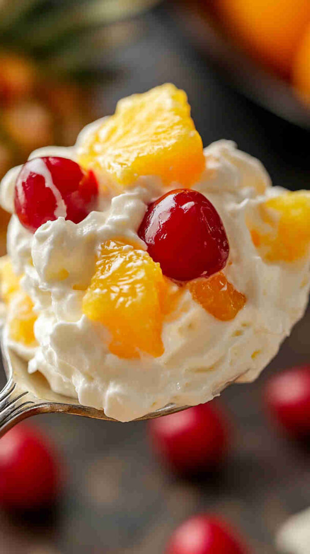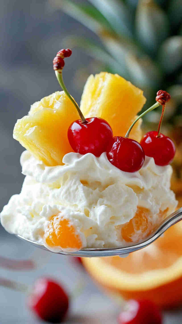 Freshly whipped heavy cream sweetened with powdered sugar and vanilla is folded with tangy sour cream, then gently combined with juicy pineapple tidbits, sweet mandarin oranges, vibrant maraschino cherries, fluffy mini marshmallows, toasted coconut, and crunchy pecans for a light, dreamy, old-fashioned treat that tastes like Grandma’s kitchen.