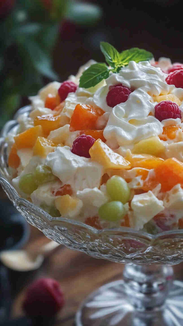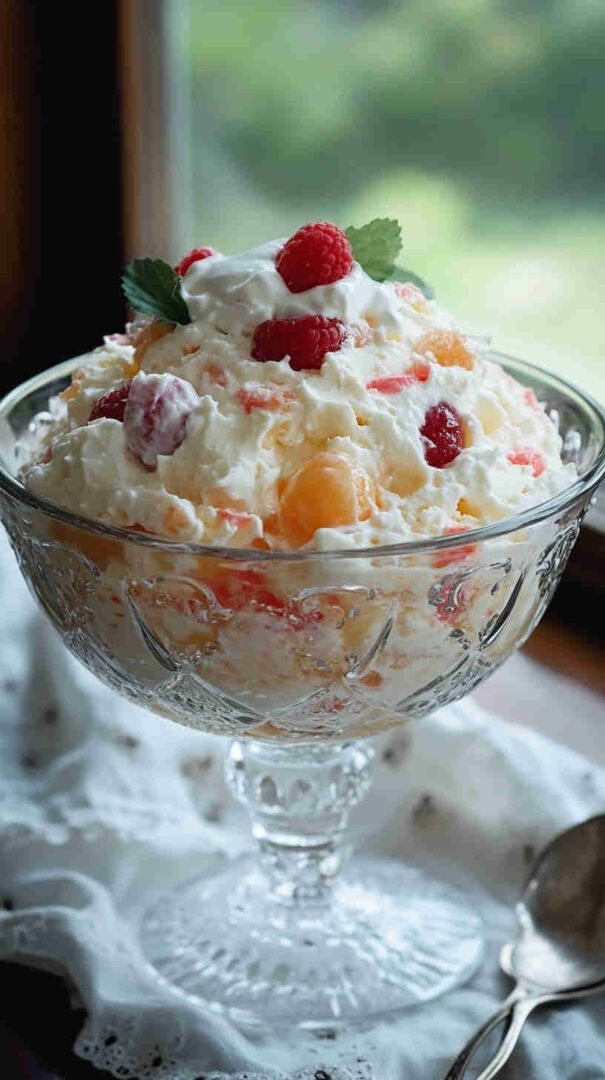 For the best texture, use full-fat heavy cream and sour cream. If you prefer a slightly sweeter salad, add an extra tablespoon of powdered sugar. The recipe is naturally gluten-free and looks especially charming served in vintage glassware or a cut-glass bowl. Always keep it chilled until ready to serve.