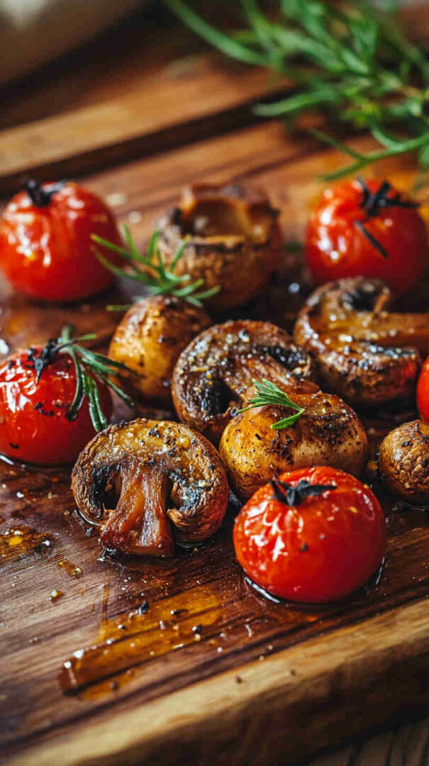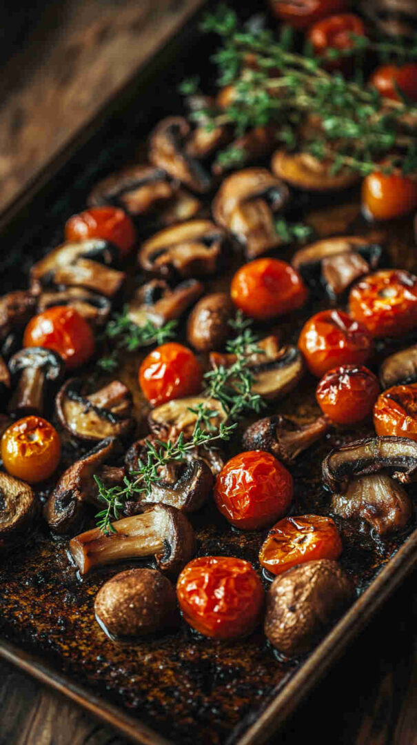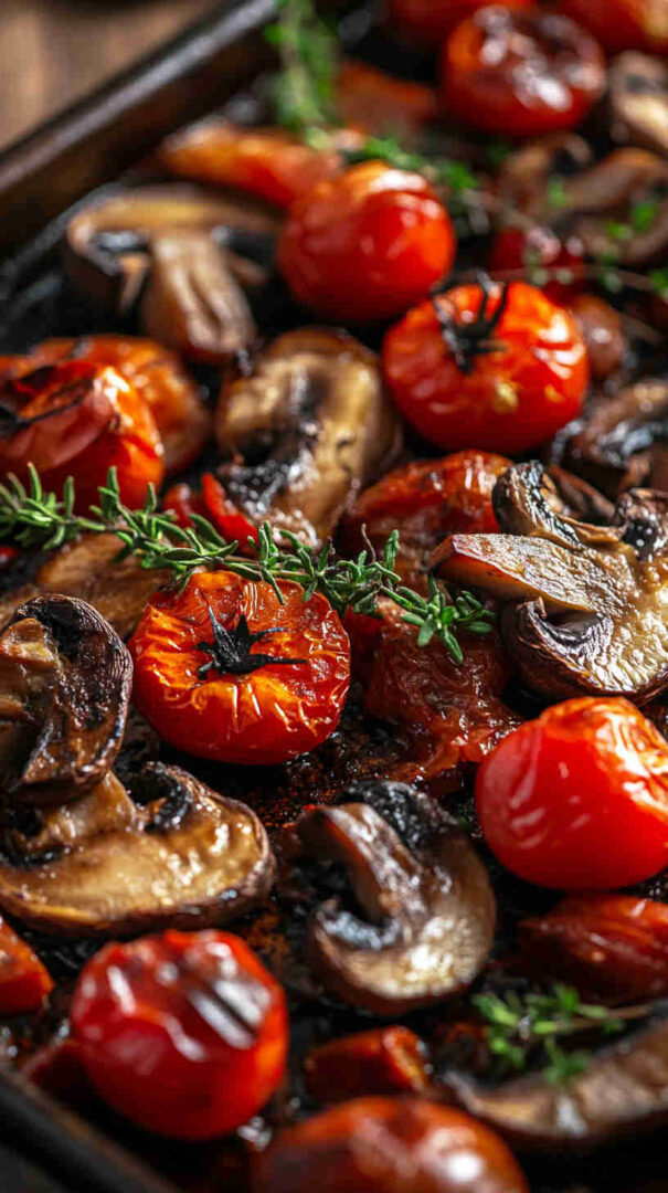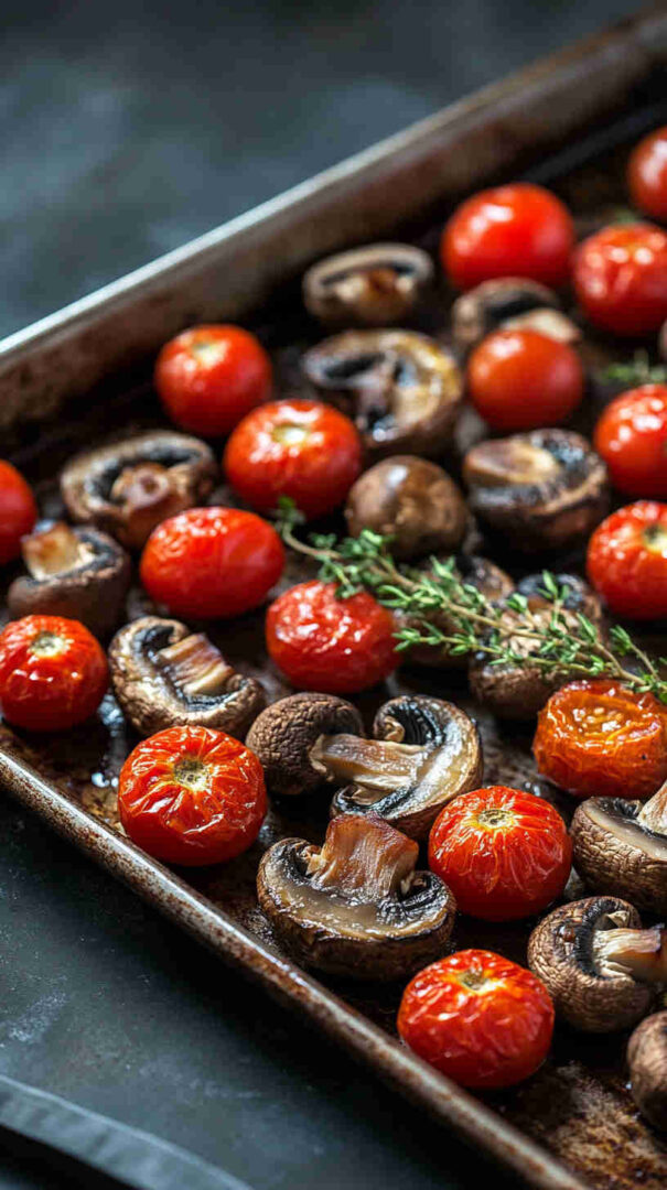 Keep cherry tomatoes whole so they burst beautifully during roasting. Pat the mushrooms dry thoroughly with a paper towel to help them brown instead of steaming. Cut mushrooms into similar-sized pieces as the tomatoes for even cooking. Spread everything in a single layer without overcrowding the baking sheet for maximum caramelization.
