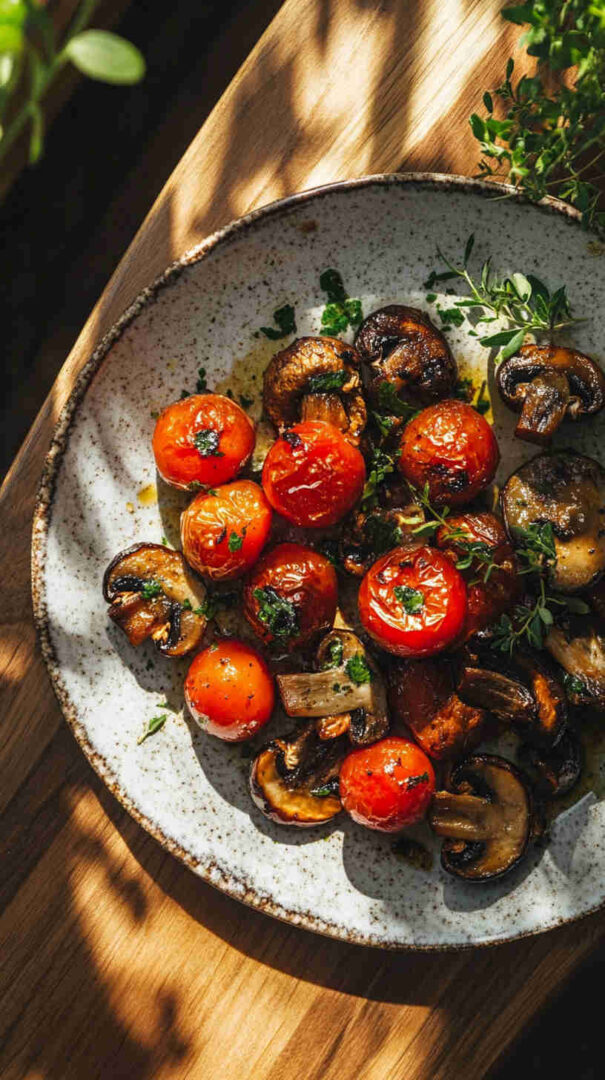 This Roasted Mushroom and Cherry Tomato recipe combines juicy cherry tomatoes with savory mushrooms, tossed in a garlic-herb olive oil blend and roasted until the tomatoes burst and mushrooms turn golden and caramelized. It creates a vibrant, juicy, and deeply flavorful side dish that’s quick, healthy, and perfect for any meal.