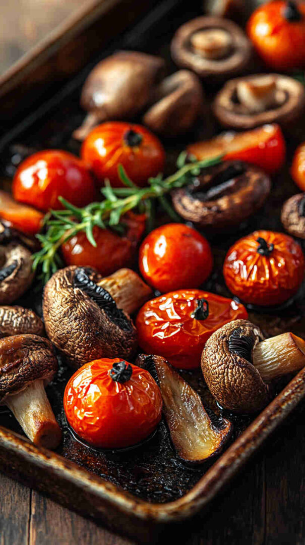 - Roast to juicy perfection — Place the pan in the hot oven and roast for 20-25 minutes. Halfway through, give a gentle stir so the tomatoes burst evenly and mushrooms brown on all sides.