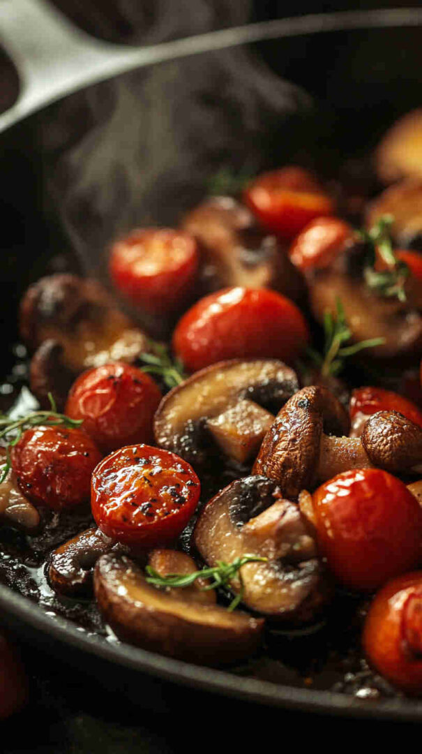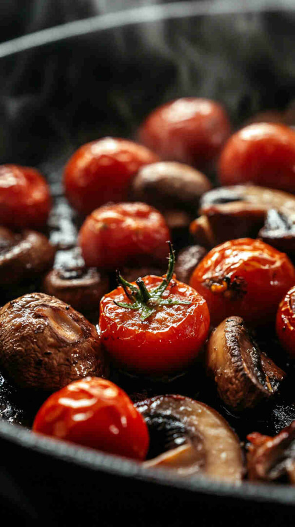 The vibrant red tomatoes against the earthy mushrooms make it visually stunning, and the juicy, caramelized flavors pair wonderfully with pasta, grilled proteins, crusty bread, or rice.