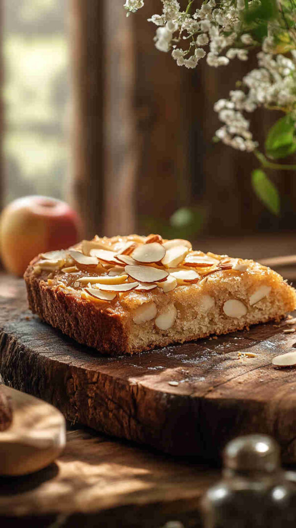 It’s rustic in the best way—uneven almond topping, golden edges, no need for perfect frosting—yet it looks stunning and tastes sophisticated. No mixer required, minimal fuss, and it uses simple ingredients to create something that feels homemade and heartfelt.