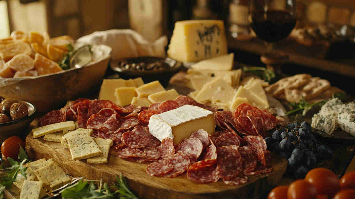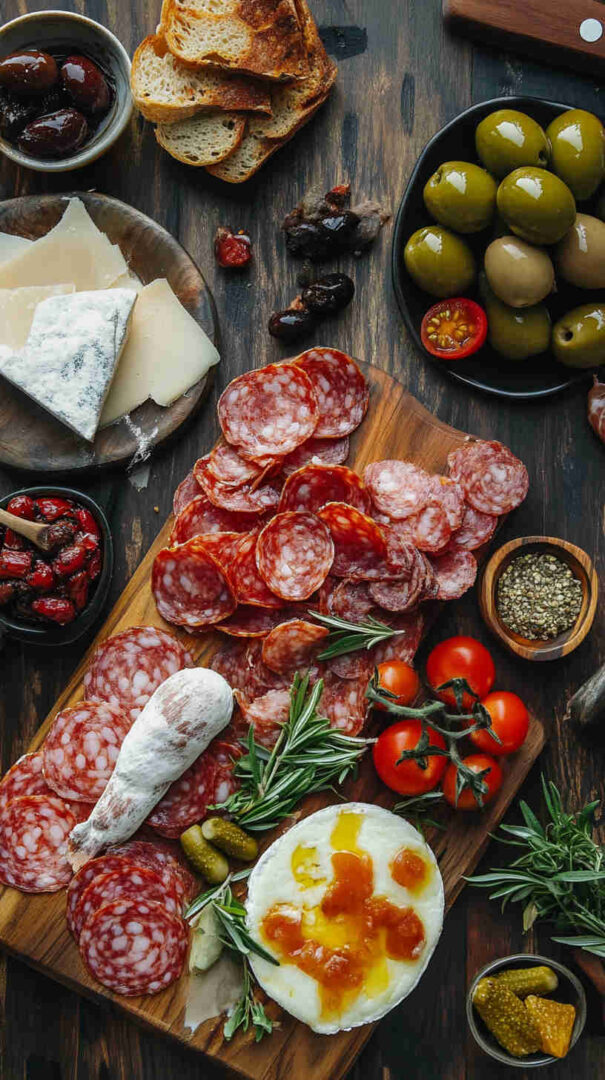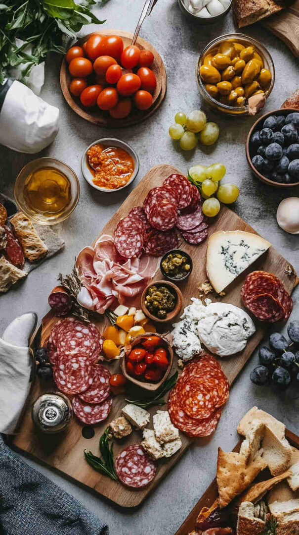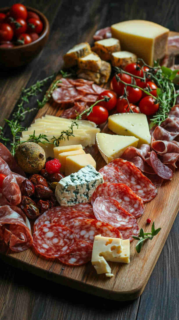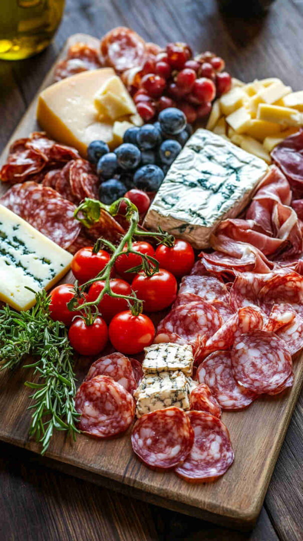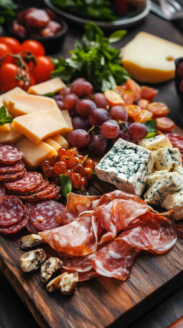 - Fresh Elements: Grapes (red/green for sweetness), fresh figs or seasonal fruit, cherry tomatoes, fresh basil—provide brightness and natural sweetness to balance saltiness.
