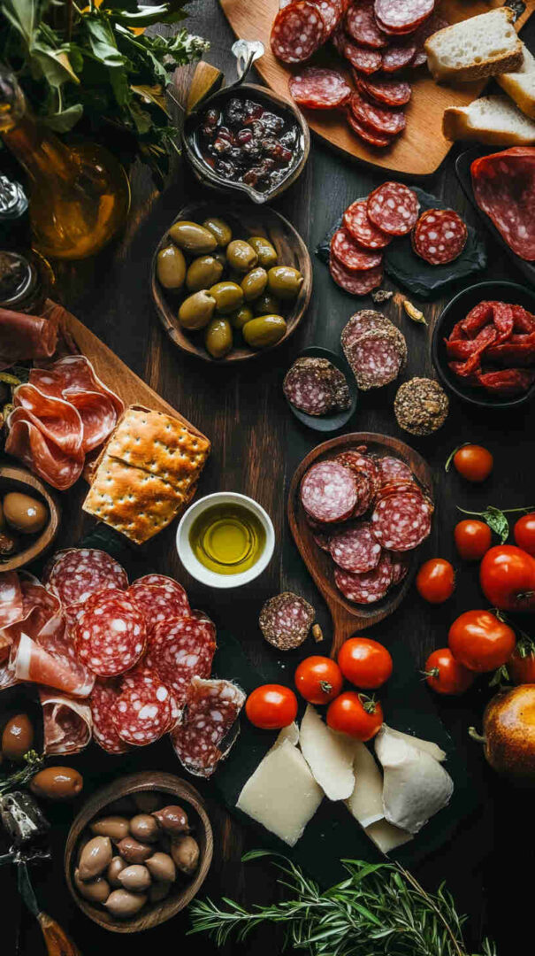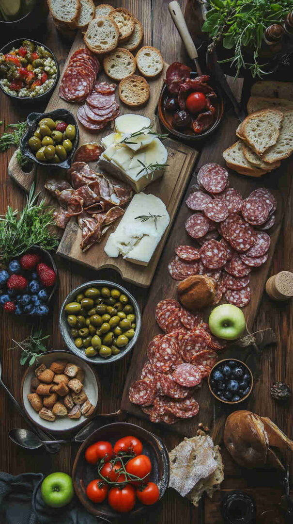 - Breads & Crunch: Crusty baguette slices, grissini sticks, or crostini—rustic Italian bread for dipping in olive oil; nuts like almonds or walnuts for texture.