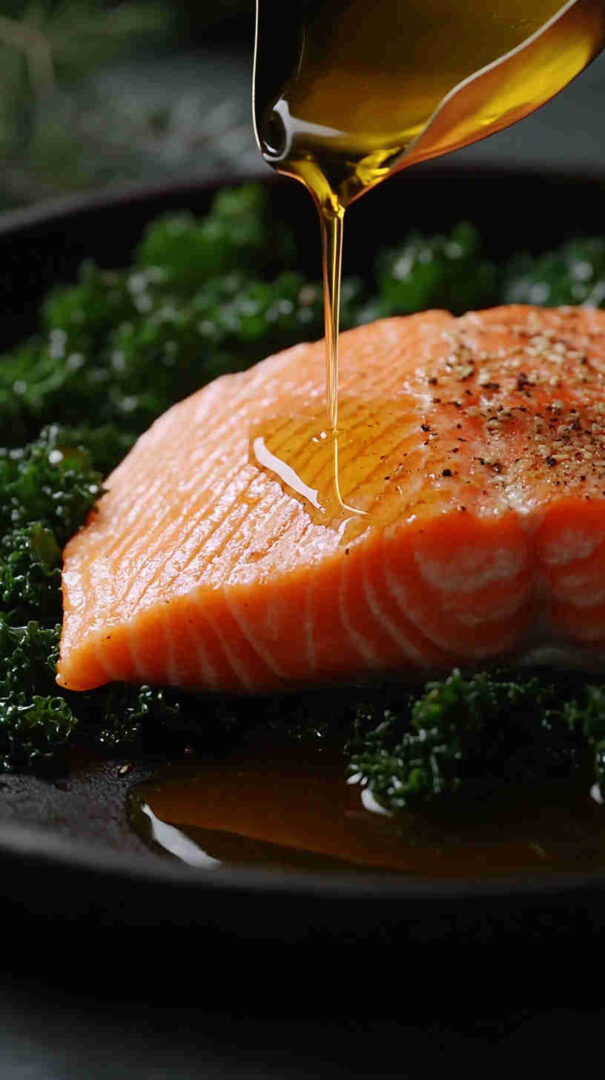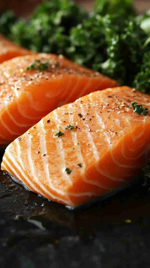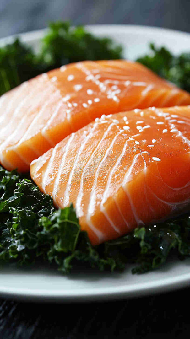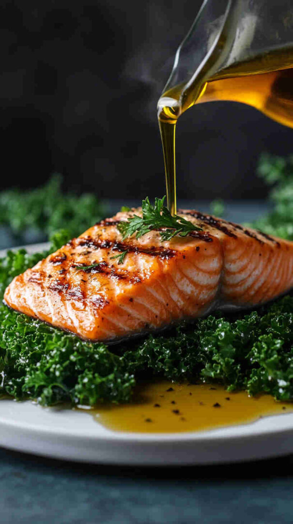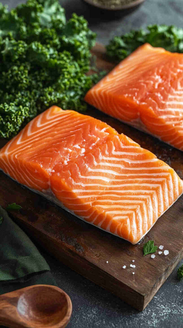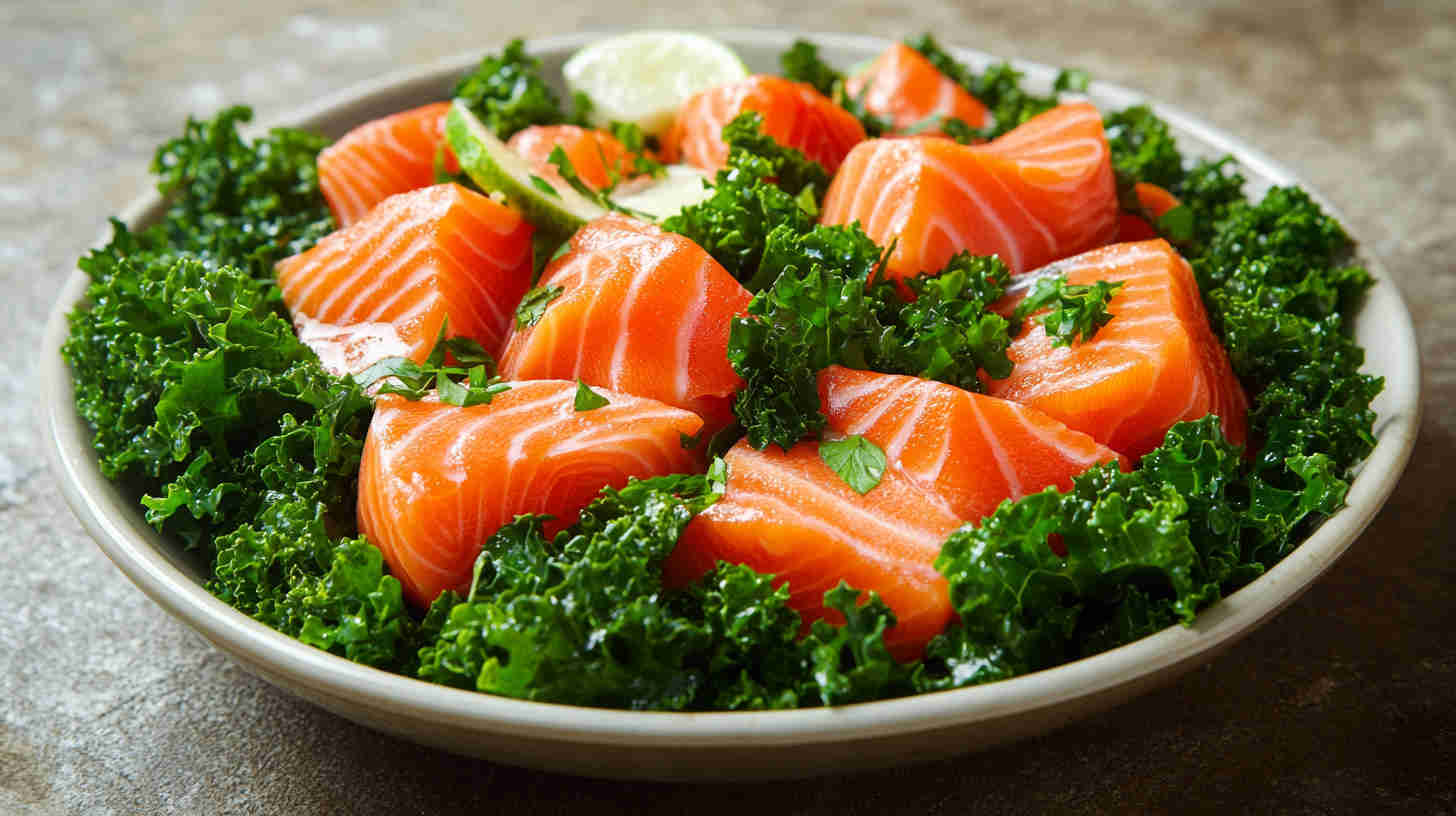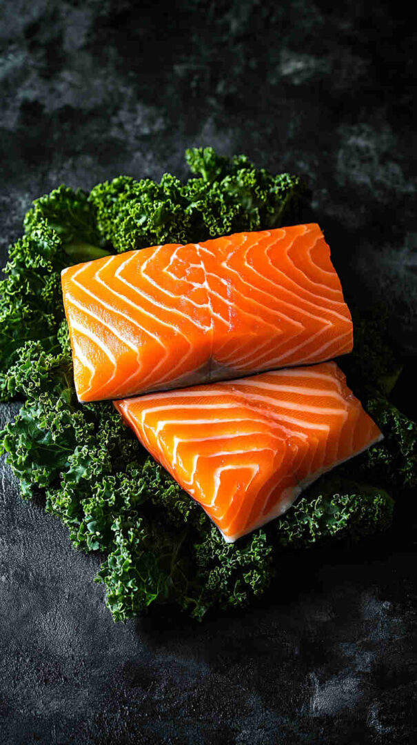 Salmon: Wild-caught or responsibly farmed fillets (skin-on preferred for crisp texture)—rich in omega-3s; fresh, bright color, no fishy smell. Kale: Curly or lacinato (dino/Tuscan)—sturdy enough to hold dressing; remove tough stems, tear or chop leaves. Extra virgin olive oil: High-quality, fruity, peppery—forms the base of the vinaigrette and shines here. Lemon: Freshly squeezed juice + zest—bright acidity that cuts richness of salmon and kale.