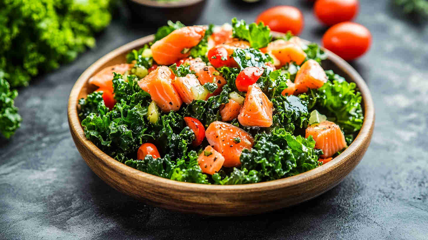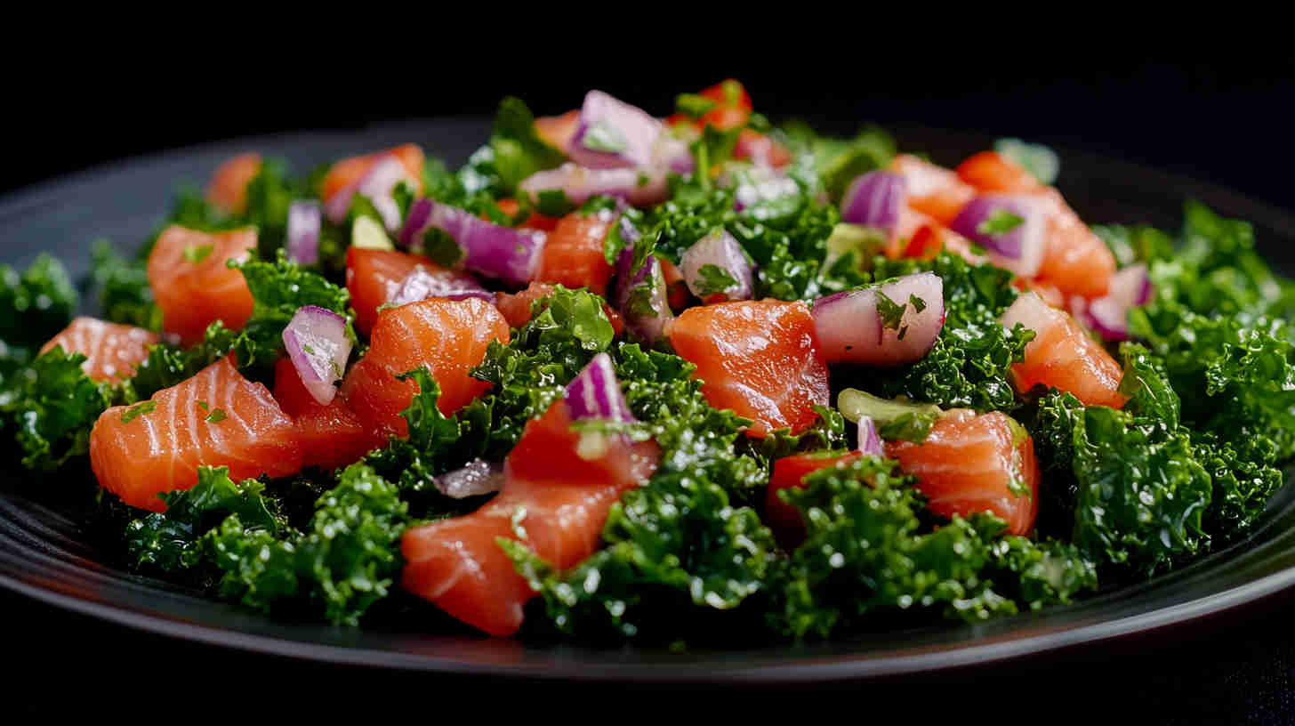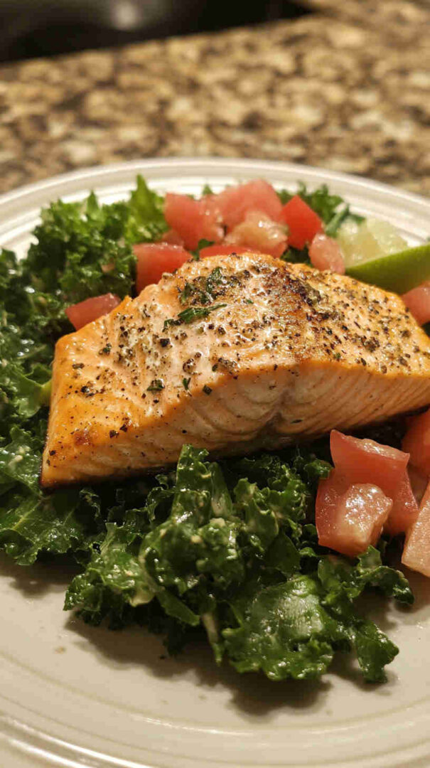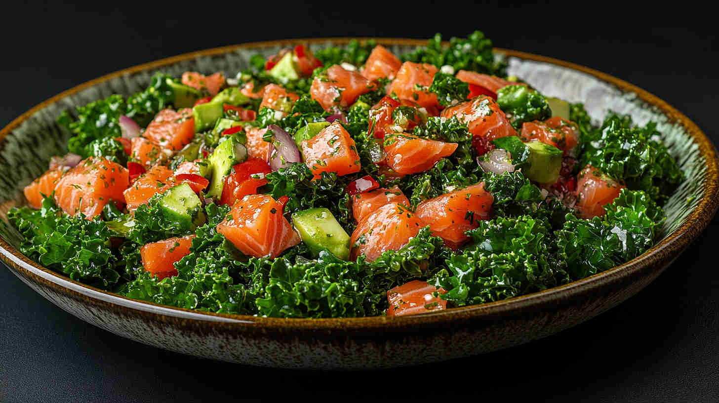 This vibrant Salmon and Kale Salad features tender, pan-seared salmon fillets atop massaged kale, crisp cucumber, juicy cherry tomatoes, shaved red onion, and creamy avocado, all drizzled with a bright lemon-garlic olive oil vinaigrette. It’s a protein-packed, nutrient-rich meal full of texture, color, and heart-healthy omega-3s—elegant yet effortless.