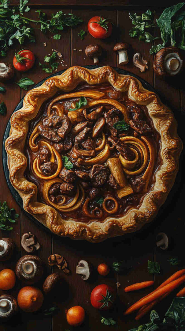 Tender chunks of beef slow-simmered with hearty mushrooms, onions, and a deeply savory gravy, then encased in a buttery, flaky homemade or puff pastry crust. This hearty pie bakes to golden perfection, offering cozy, umami-packed comfort that’s perfect for family dinners or special weekends.
