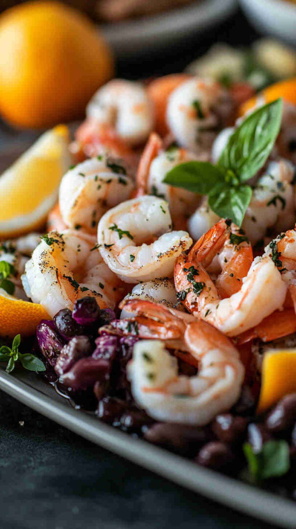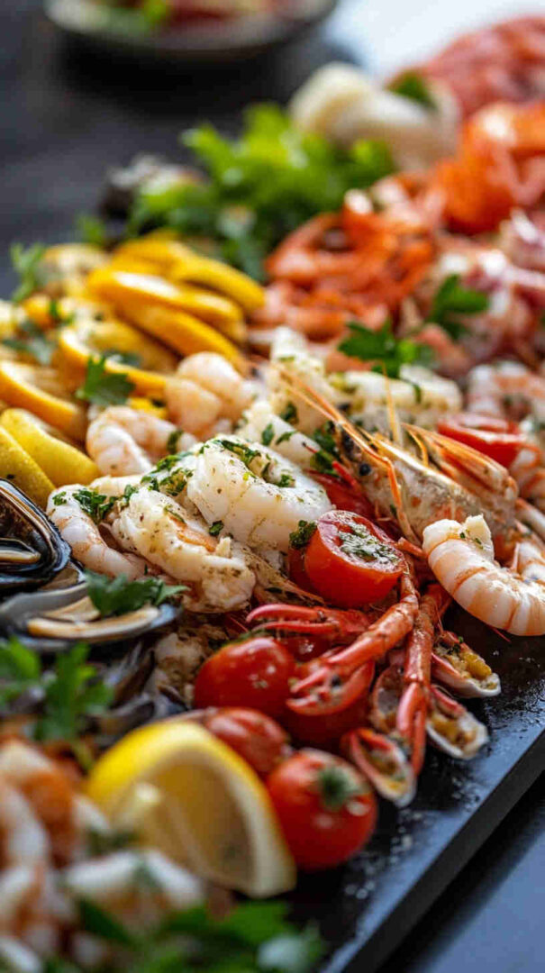 Marinate at least 2-4 hours (or overnight) for deepest flavor, but serve chilled or room temp. Use high-quality extra-virgin olive oil and fresh lemons — the dressing is everything. Drain excess liquid before plating to avoid sogginess. Arrange artfully: mound seafood in center, surround with colorful accents.