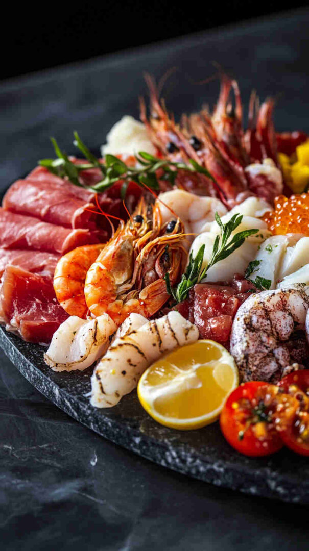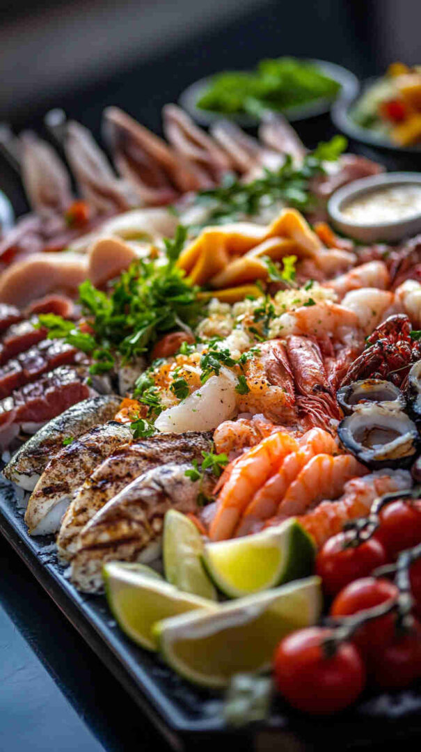 Vegetarian twist: replace seafood with marinated mushrooms, grilled eggplant, or roasted veggies. Gluten-free: use GF crackers/bread. Enhance with fresh dill or mint for herbal twist, or a splash of white wine vinegar in marinade for tangier profile. Serve as individual plates or skewers for parties.