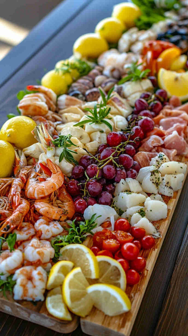 Guests love the variety — tender bites, tangy pickles, creamy artichokes — making it a conversation starter and crowd-pleaser that screams “authentic Italian seaside elegance.”