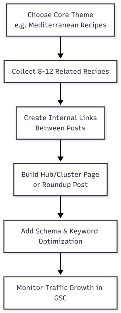 - Optimize images, create internal links to 3 related recipes, and build a small cluster hub.
