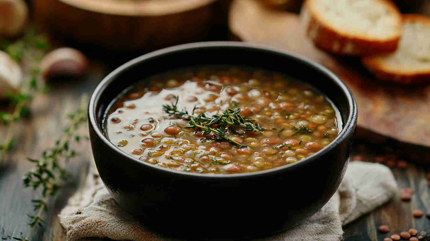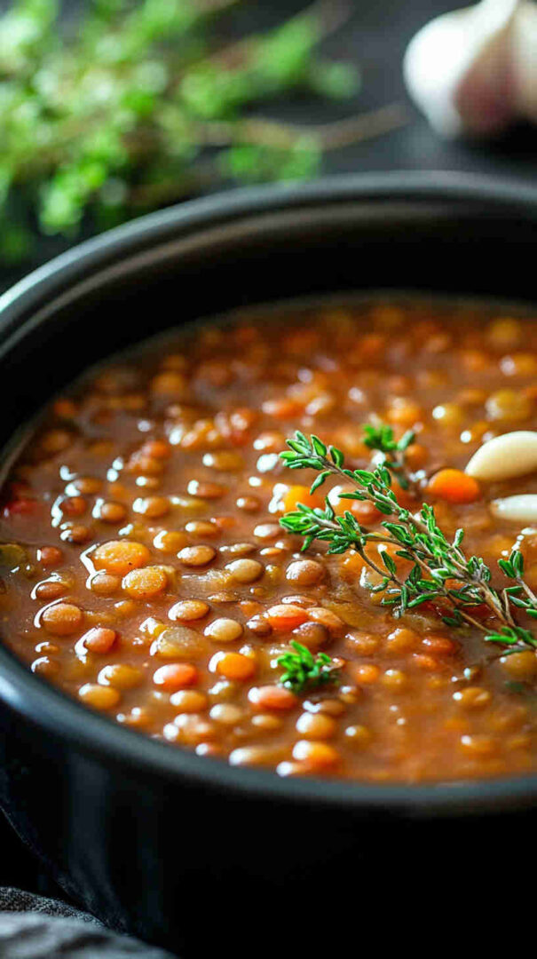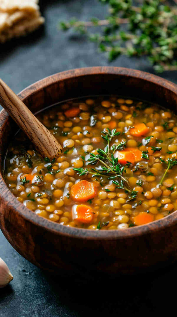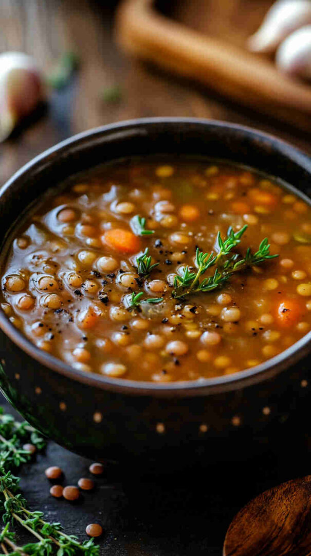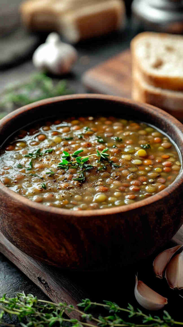 Hearty lentil soup infused with garlic and fresh thyme—simple, savory, and deeply comforting