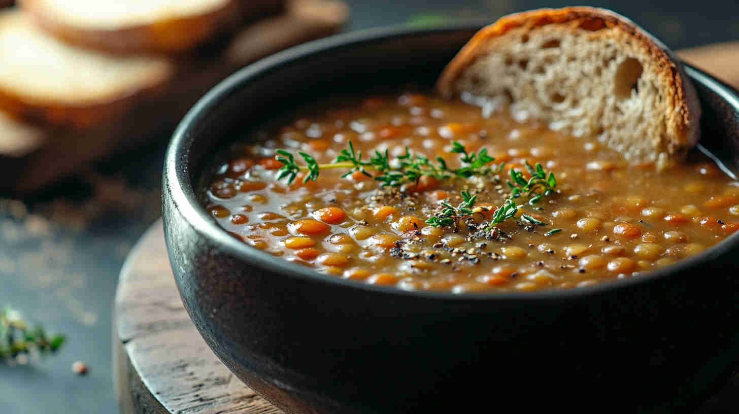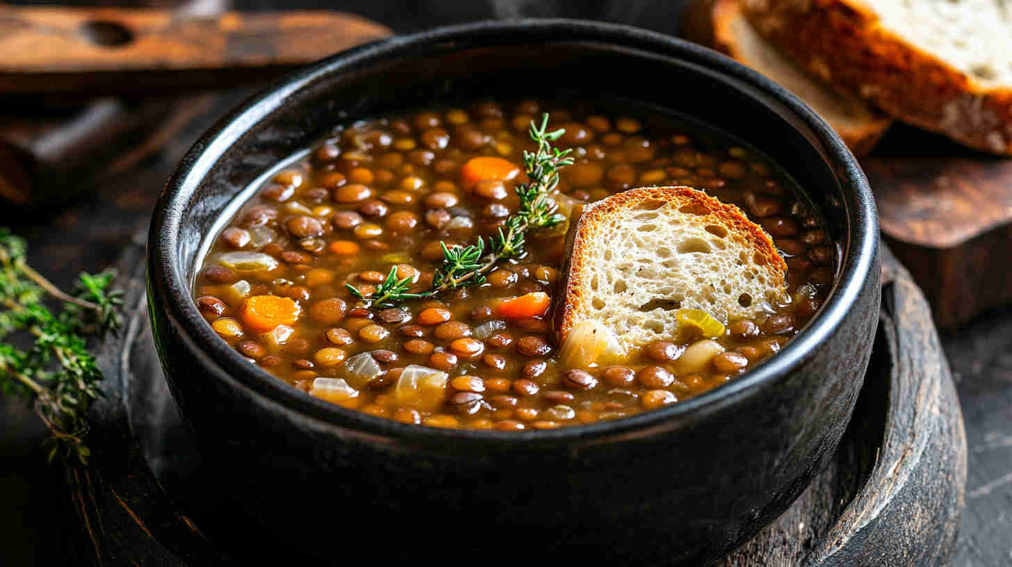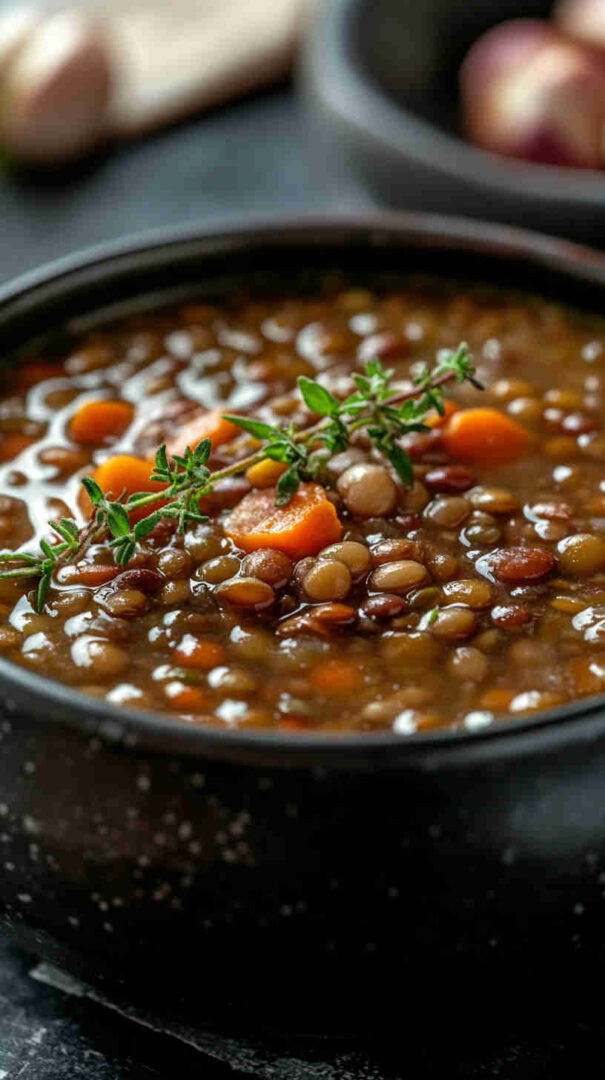 Hearty lentil soup infused with garlic and fresh thyme—simple, savory, and deeply comforting