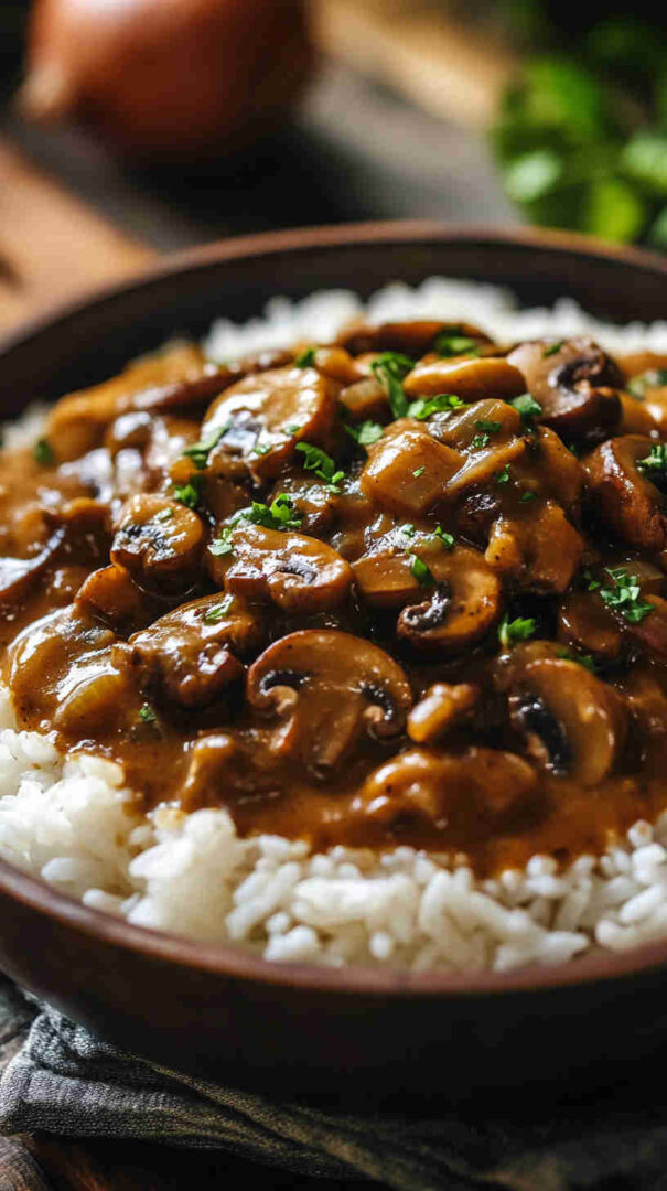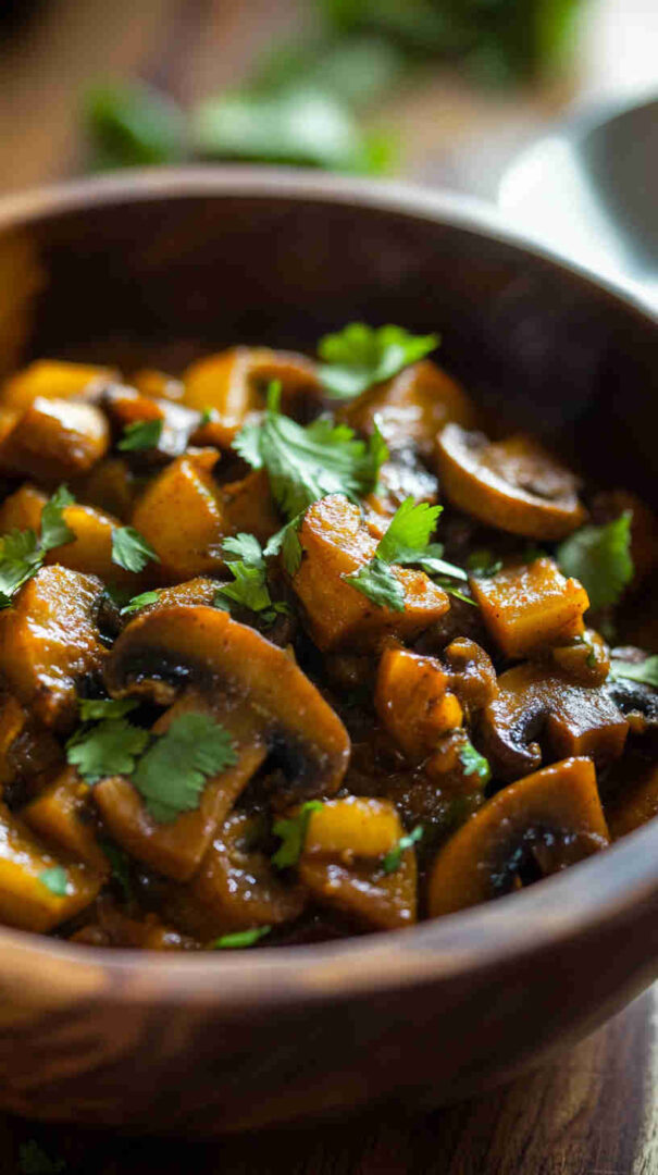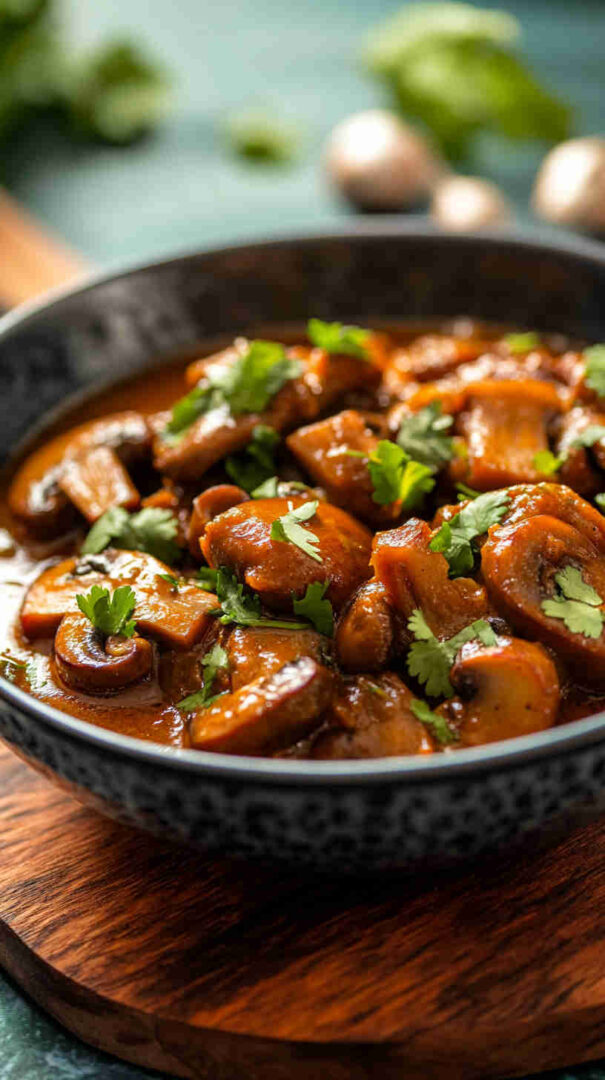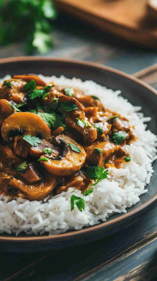 - Pour in the thick coconut milk, give everything a gentle stir, lower the heat, and let it simmer 5–7 minutes until the gravy thickens slightly and mushrooms are tender but not mushy. Taste and adjust salt or spice.