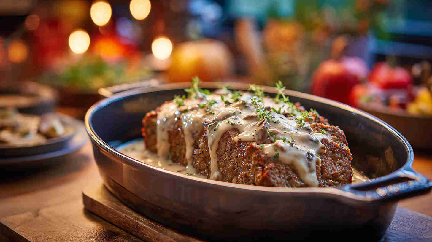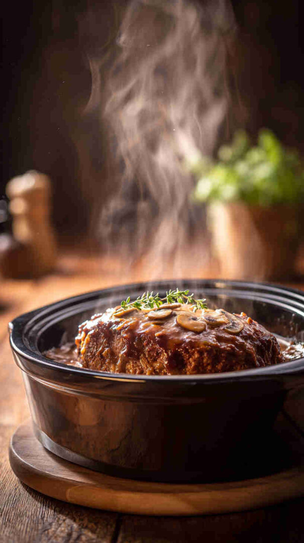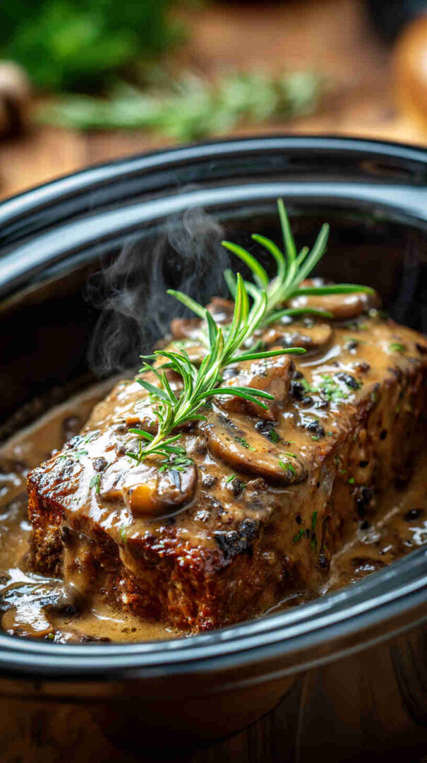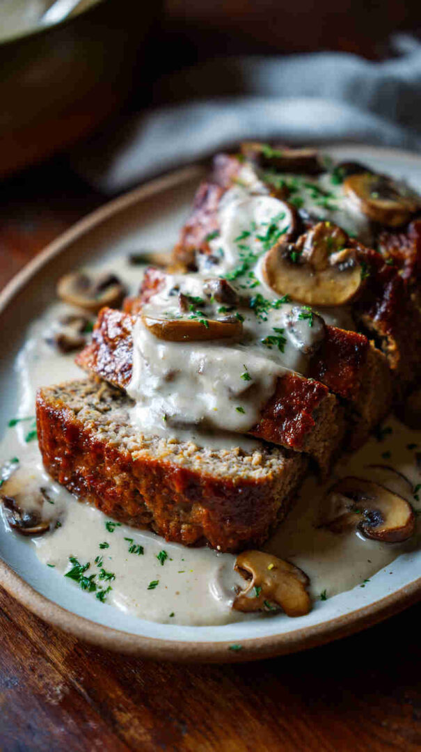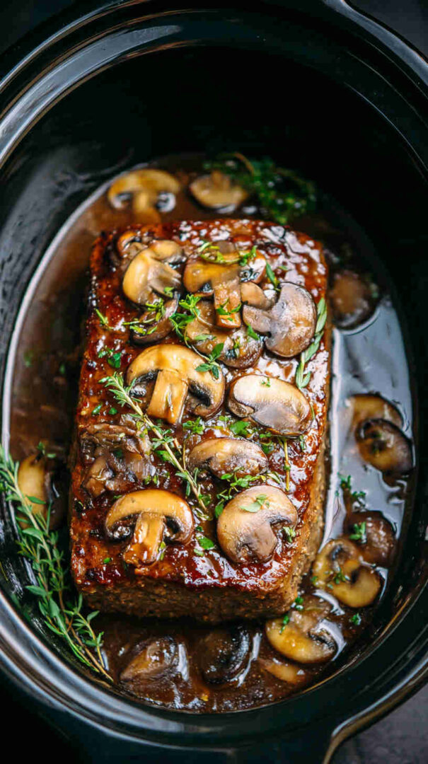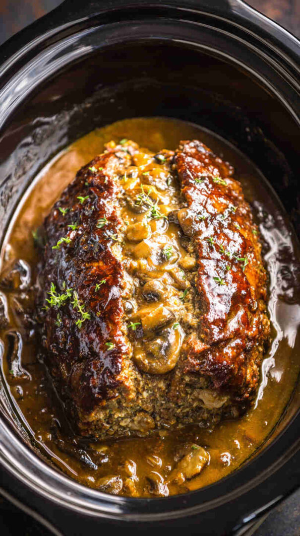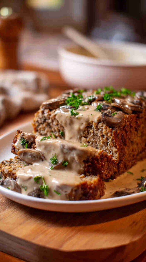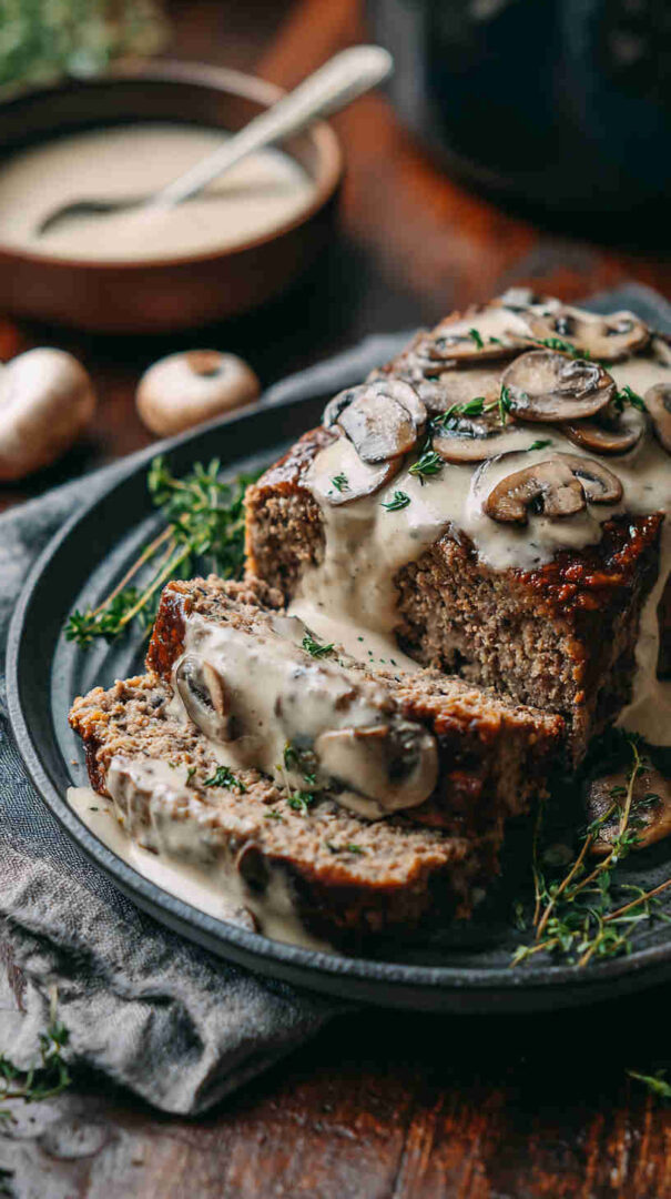 Juicy slow-cooked meatloaf loaded with mushrooms, topped with creamy mushroom gravy—easy, comforting, and full of flavor.