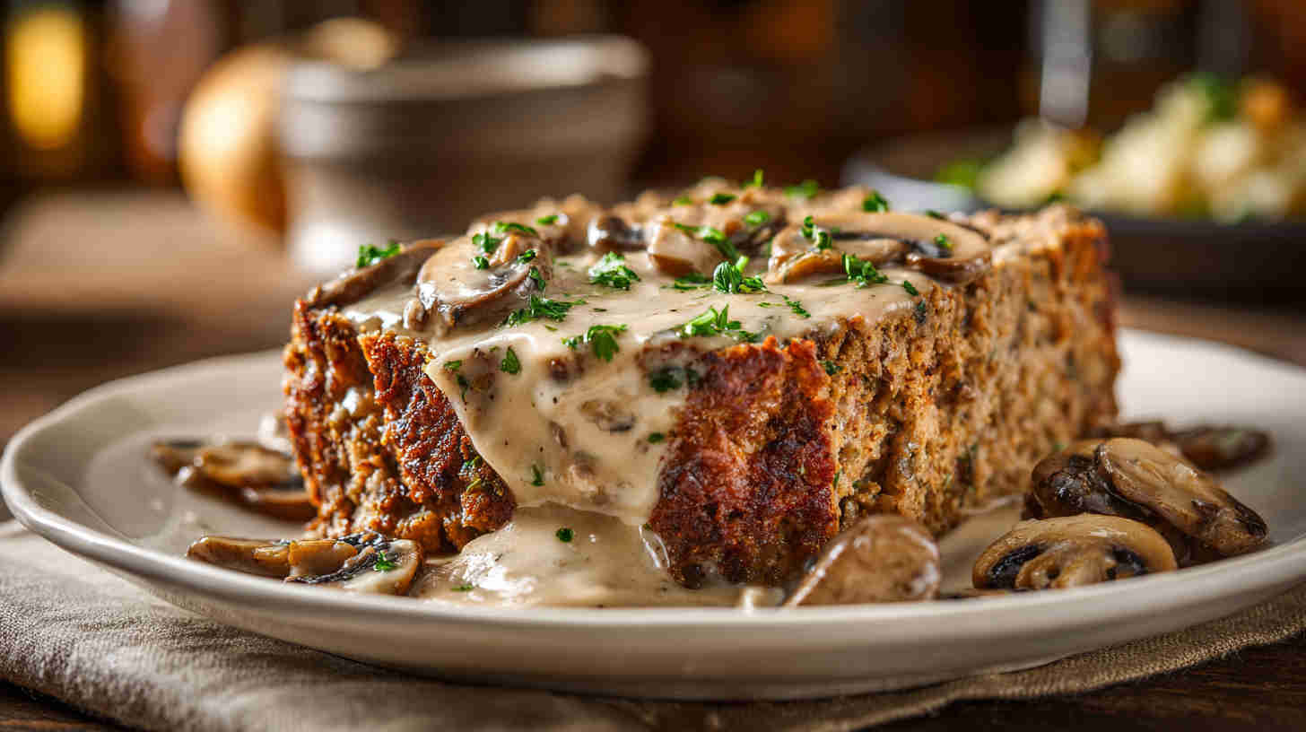 Juicy slow-cooked meatloaf loaded with mushrooms, topped with creamy mushroom gravy—easy, comforting, and full of flavor.
