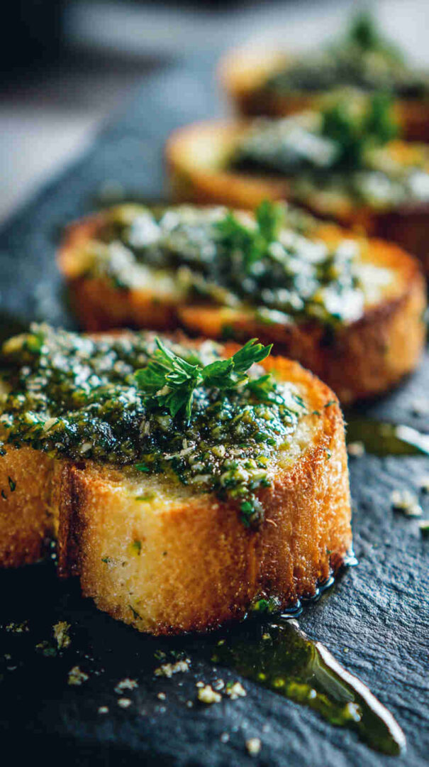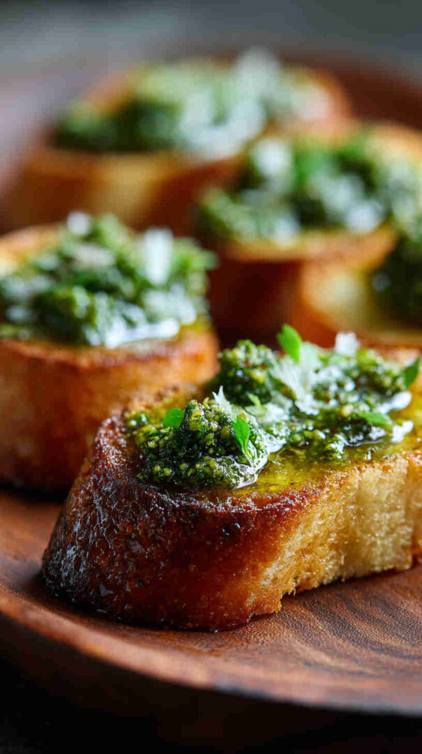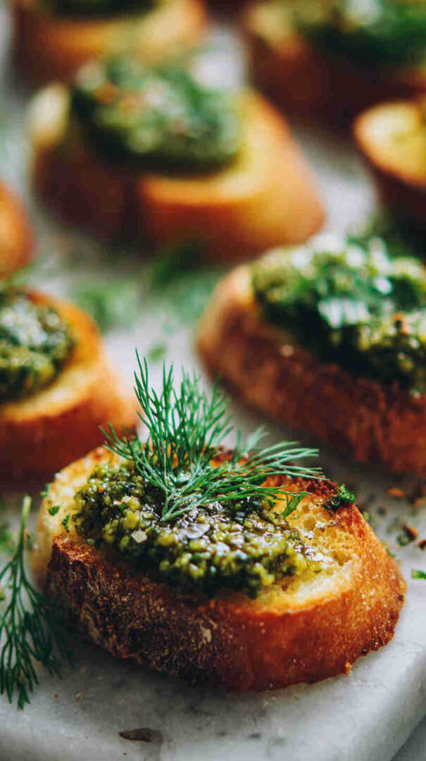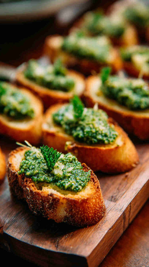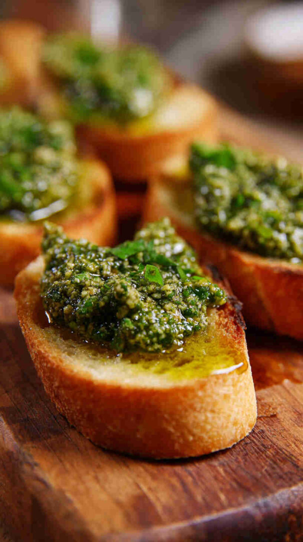 Spread on golden, crunchy crostini, it creates an irresistible contrast of textures: crisp bread against creamy pesto.