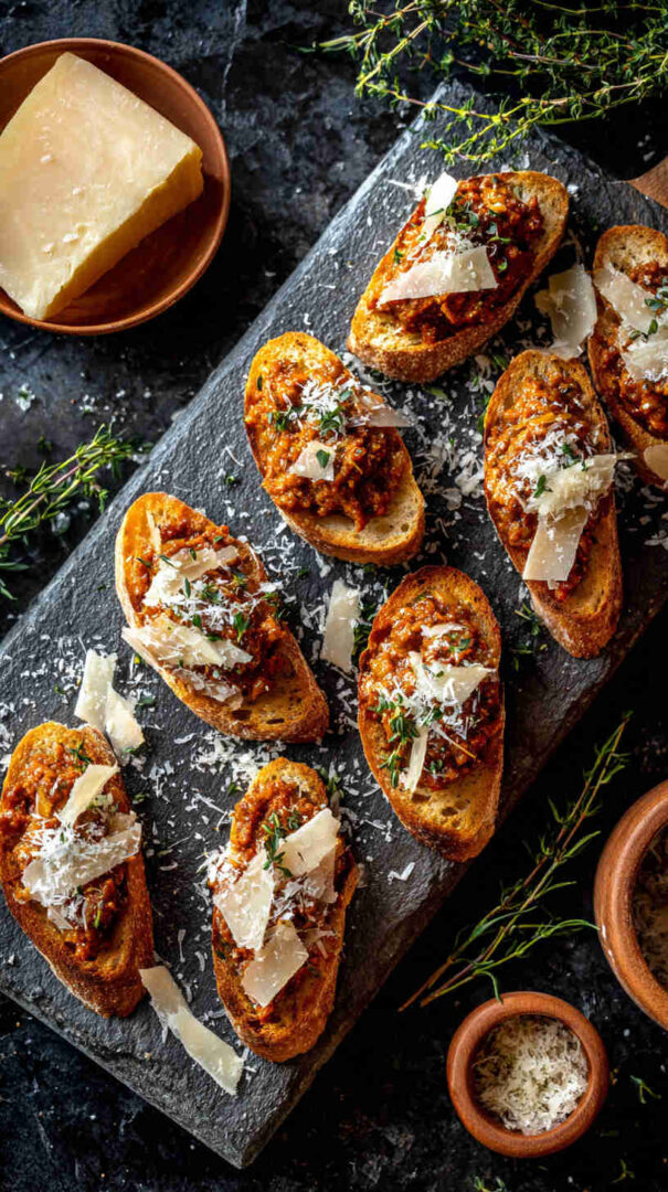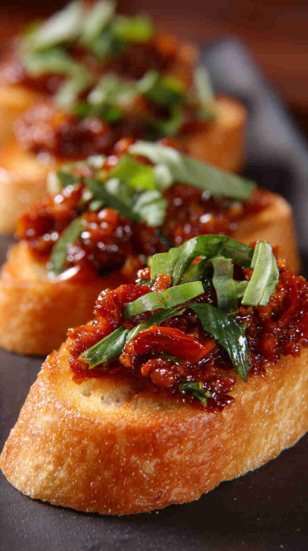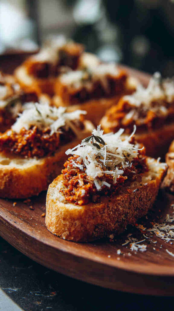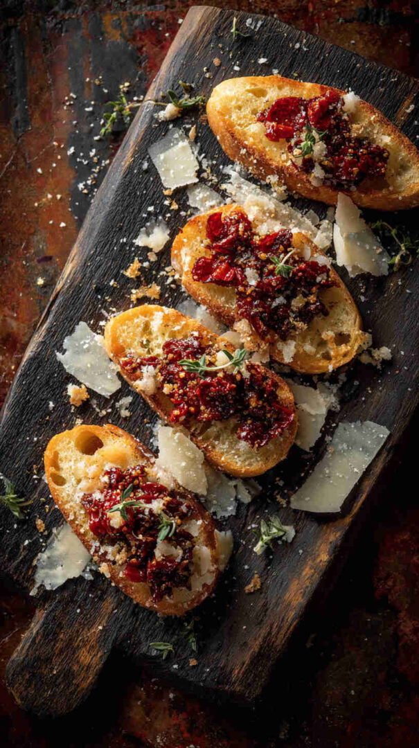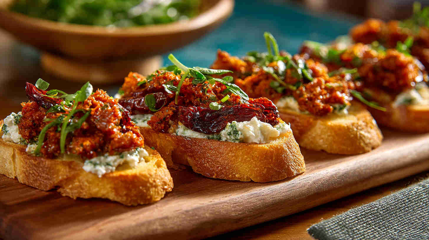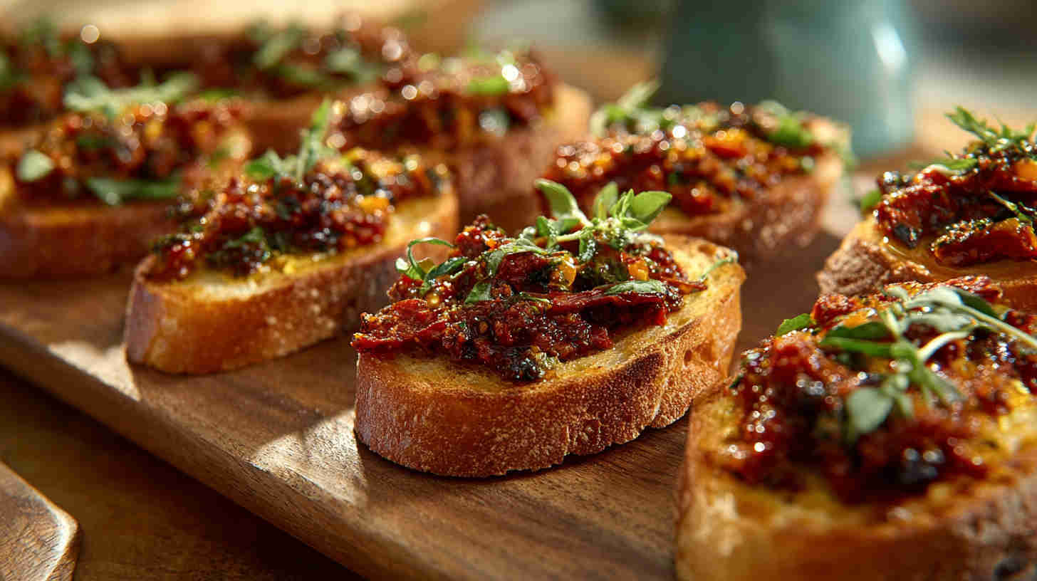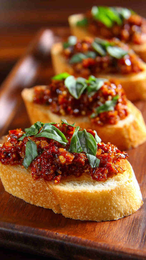 Crispy crostini topped with vibrant homemade sun-dried tomato pesto—easy, tangy Italian appetizer perfection.