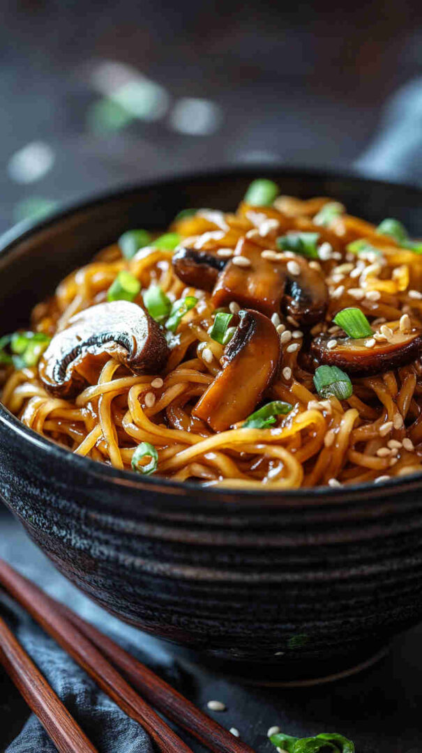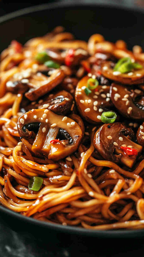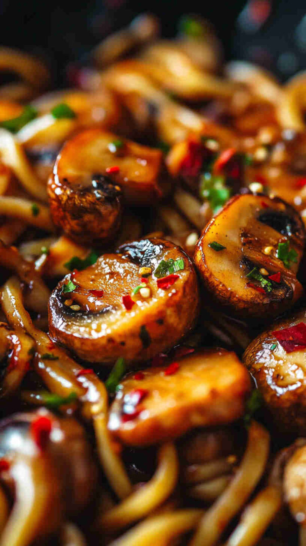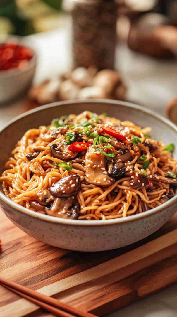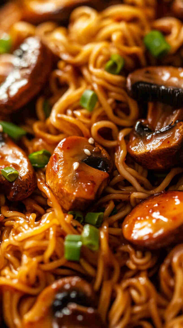 Chewy noodles with caramelized mushrooms in glossy sweet-spicy Asian sauce — quick, umami-packed, and irresistible!