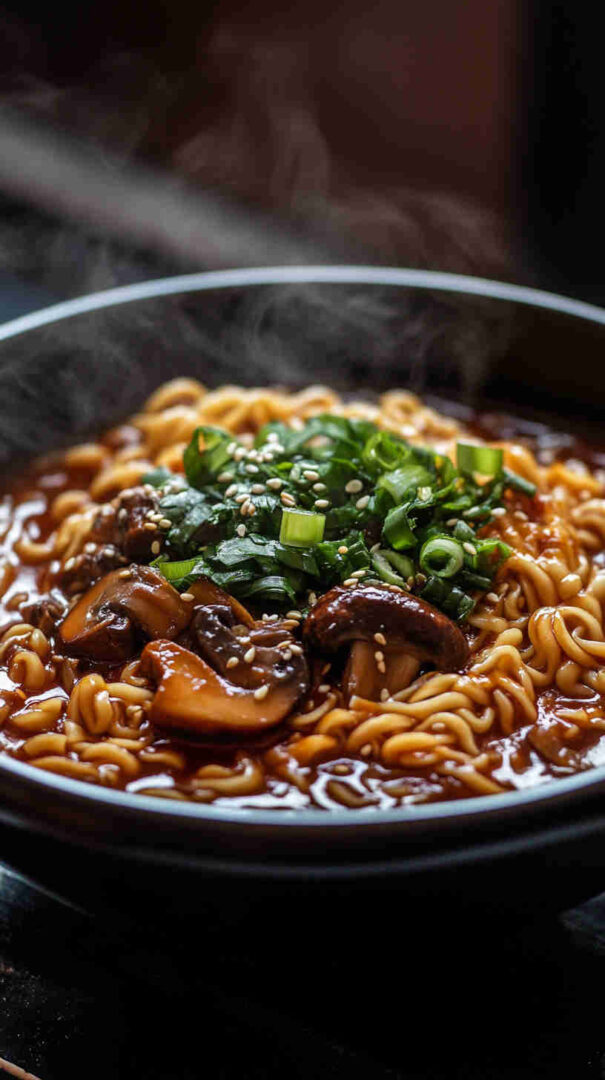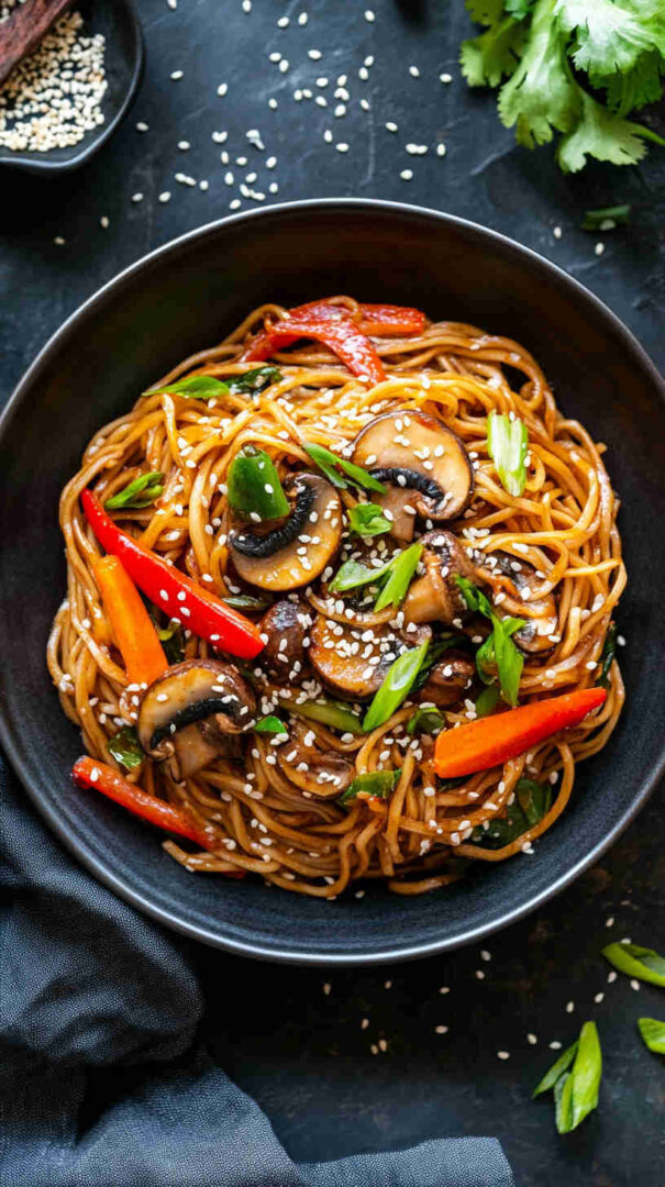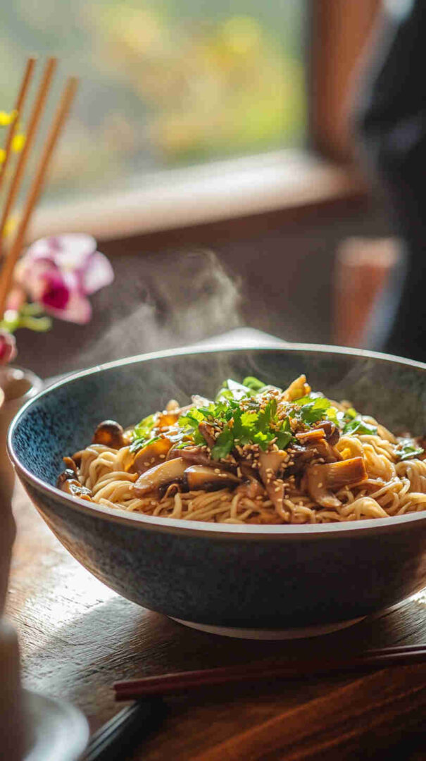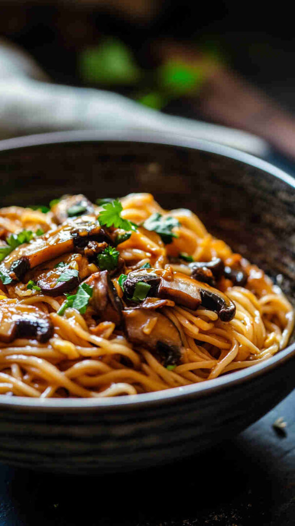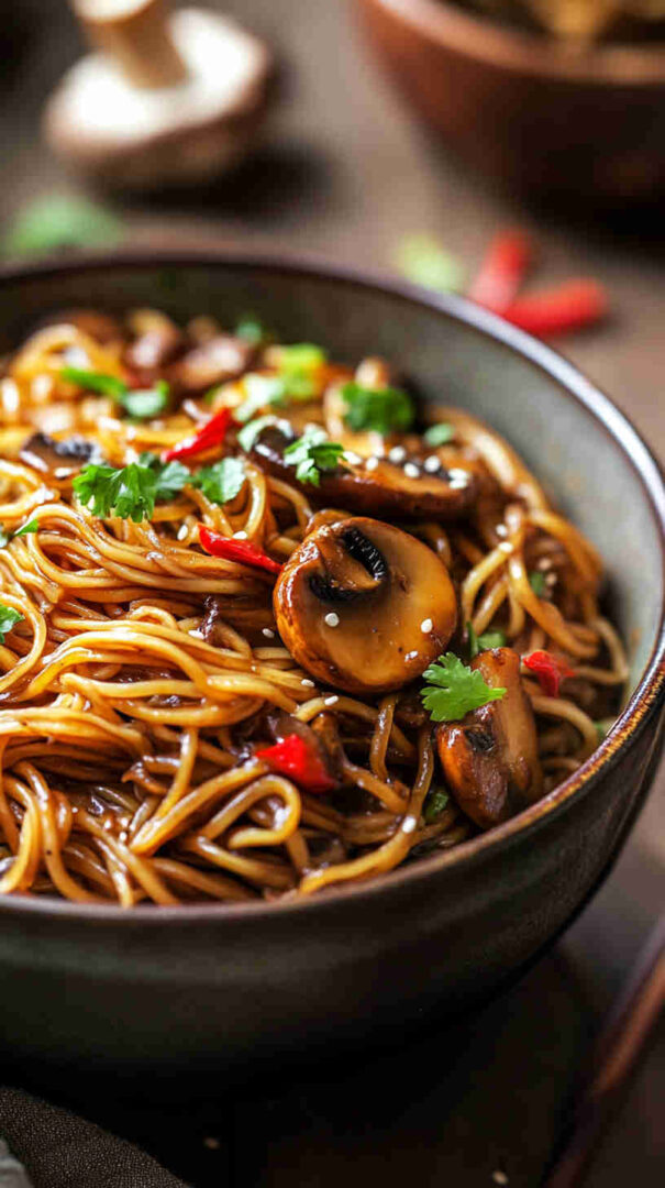 Chewy noodles with caramelized mushrooms in glossy sweet-spicy Asian sauce — quick, umami-packed, and irresistible!