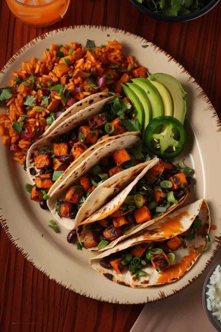 Vegetarian tacos filled with roasted sweet potatoes, black beans, and fresh toppings for a delicious and healthy dinner.