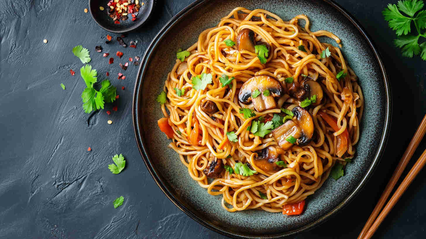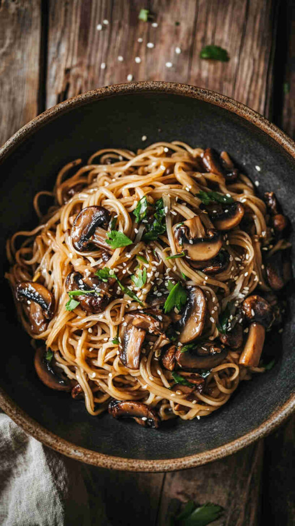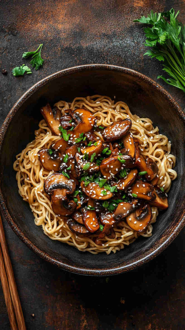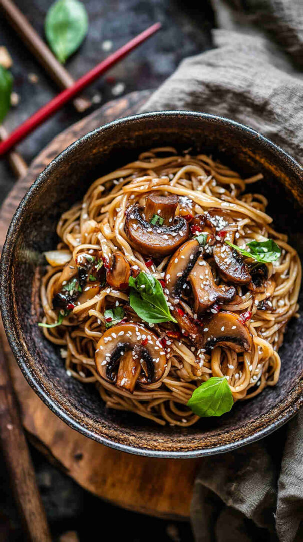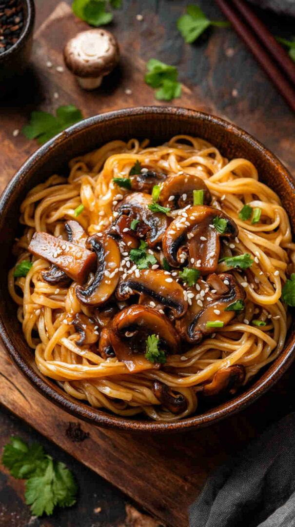 Quick, savory teriyaki mushroom noodles with chewy strands and glossy sauce — easy Asian vegetarian dinner in under 30 minutes.