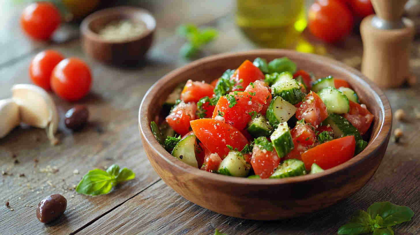 Tomatoes: Ripe, firm but juicy vine-ripened, Roma, or cherry—choose heavy ones with deep color and sweet aroma at the stem; they provide the salad’s juicy backbone. Cucumbers: English or Persian preferred—thin-skinned, fewer seeds, crisp texture; regular field cucumbers work if peeled and seeded to avoid bitterness.