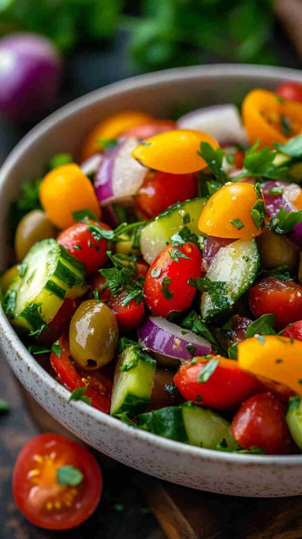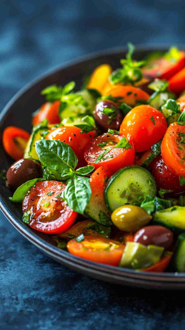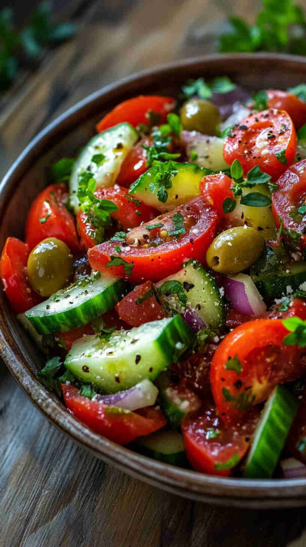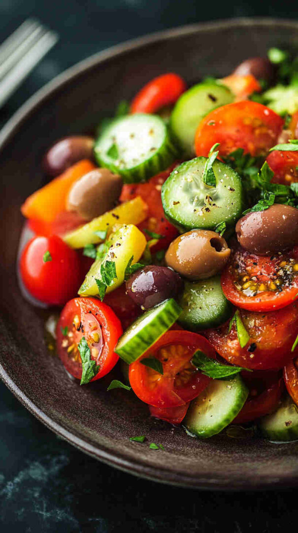 The briny Kalamata olives add that irresistible salty depth Italians adore, while red onion brings gentle bite and fresh herbs (like basil or parsley) provide aromatic lift. The dressing—nothing more than good olive oil, red wine vinegar, salt, and pepper—lets the vegetables’ natural flavors take center stage without overpowering them.