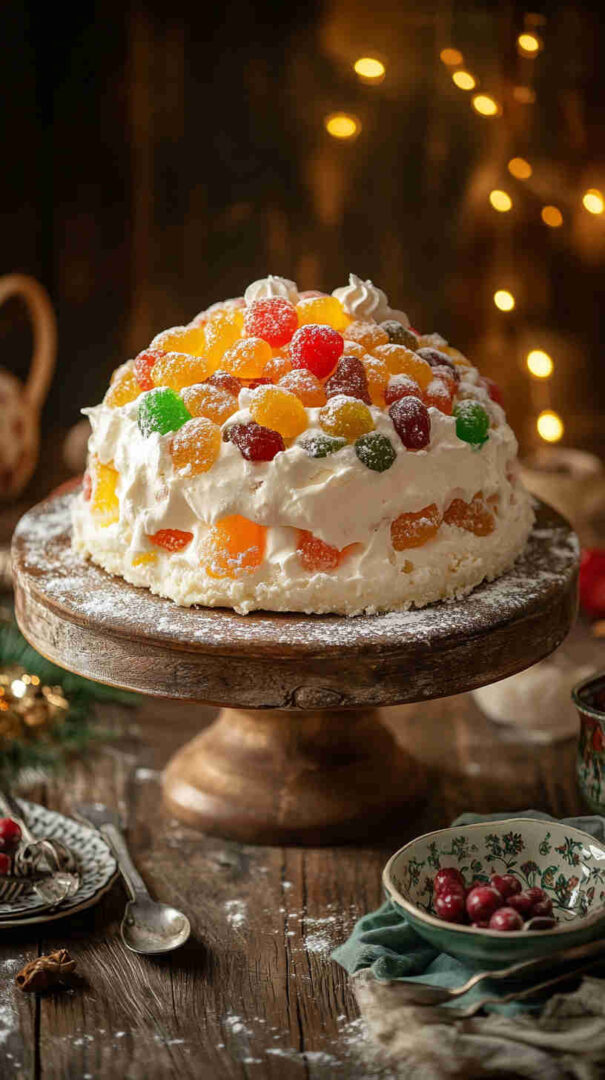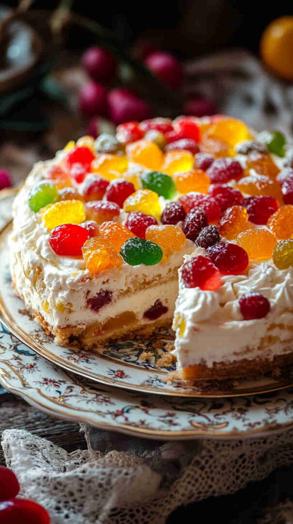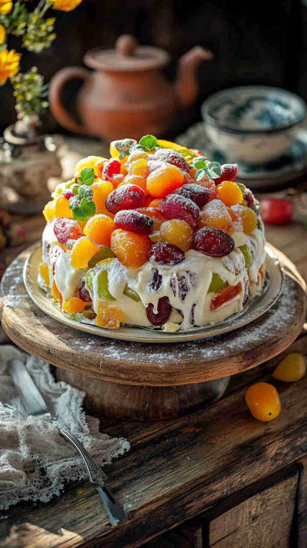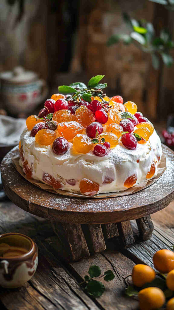 - Crown with glossy royal icing — Beat powdered sugar, egg white, and lemon juice until thick and shiny. Spread or pour over the top, letting it drip slightly down the sides for that classic look. While wet, arrange candied fruits in an artistic pattern — make it festive and colorful!