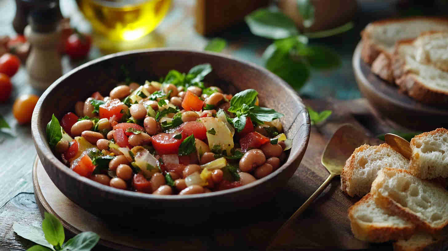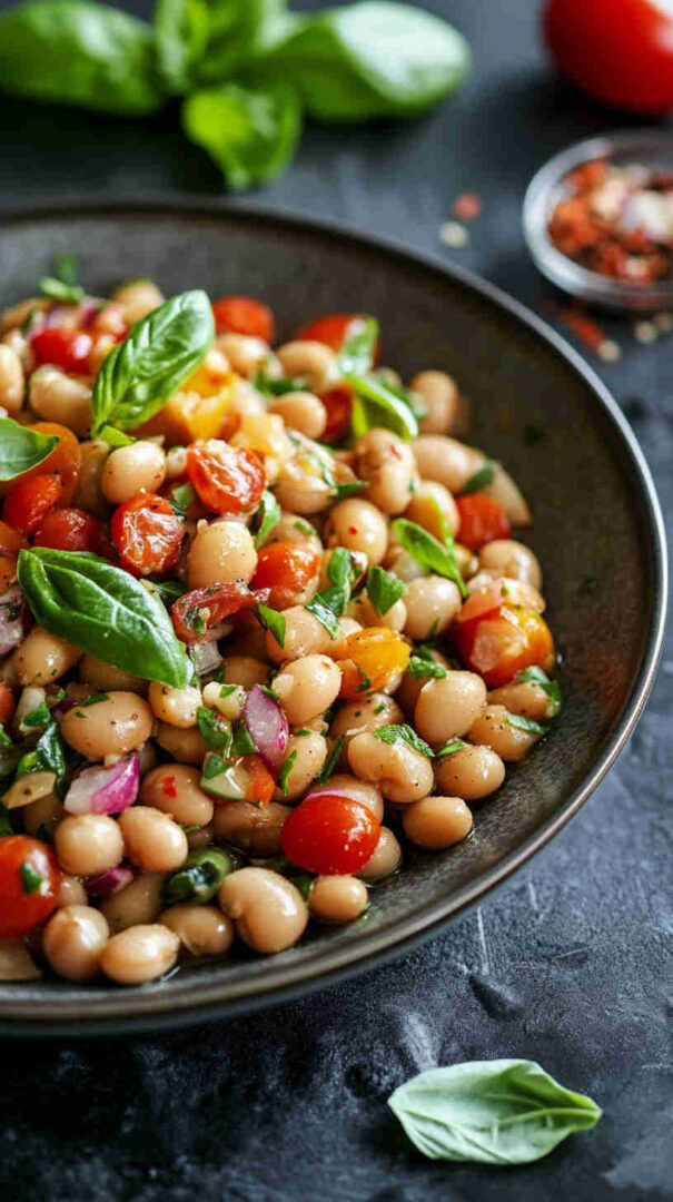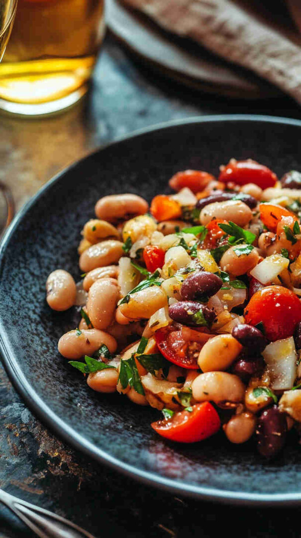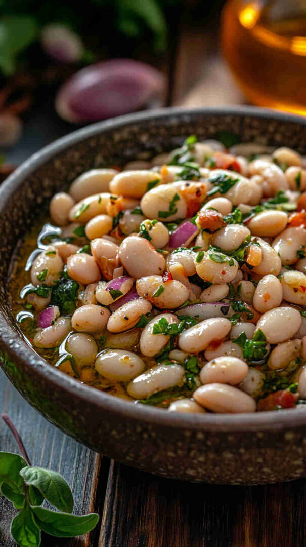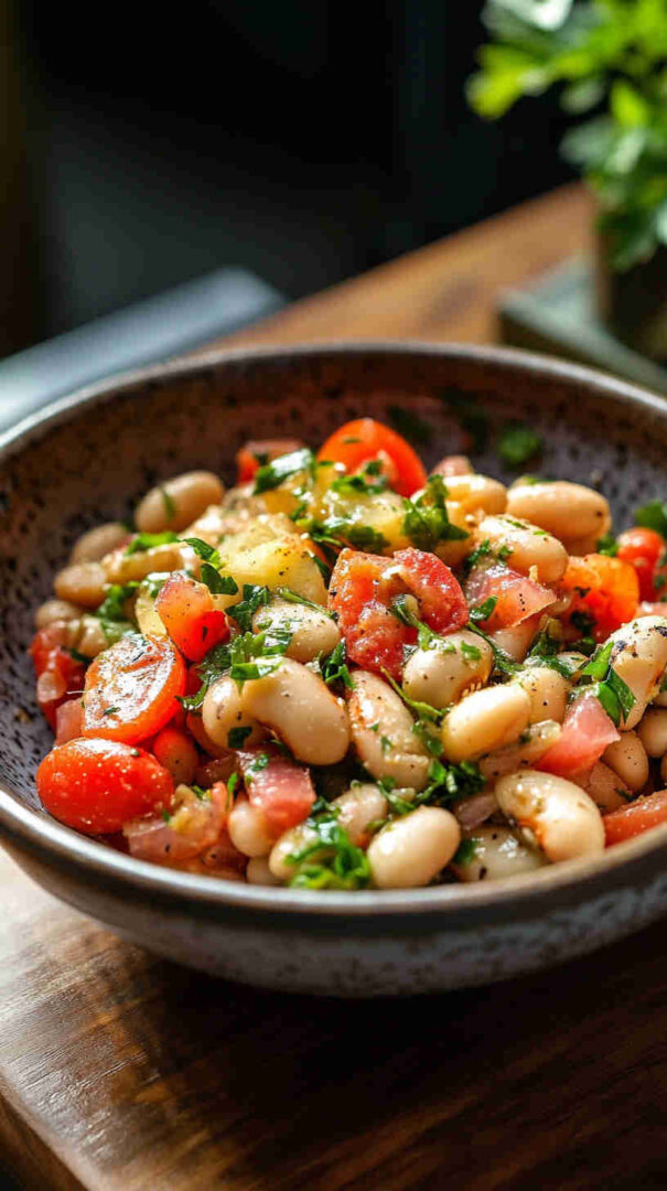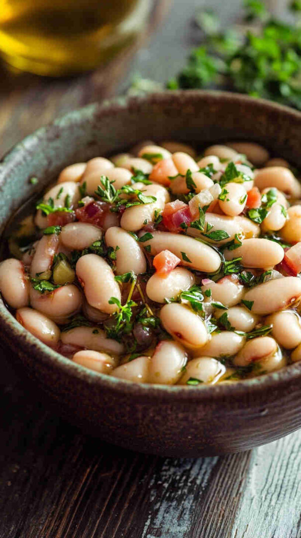 Creamy cannellini beans with tomatoes, red onion, olives, herbs, and olive oil vinaigrette—rustic Tuscan delight.