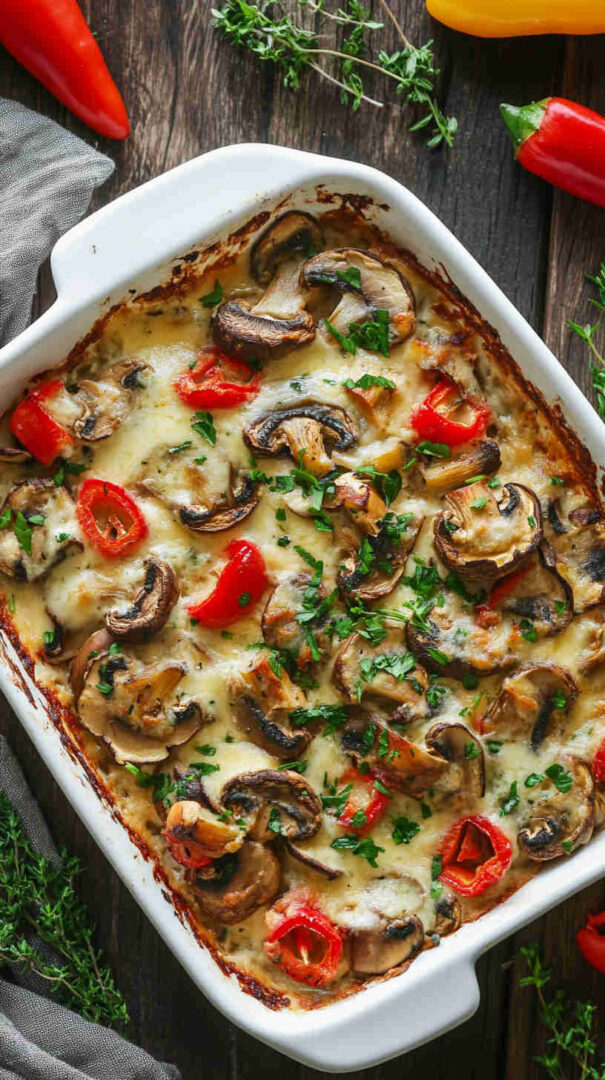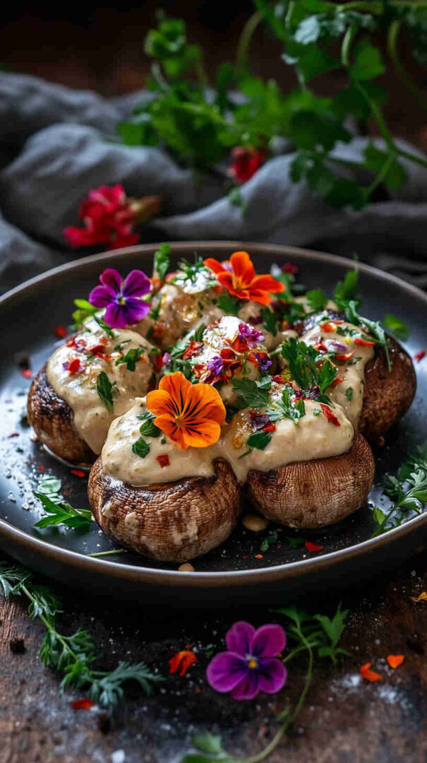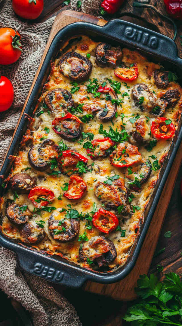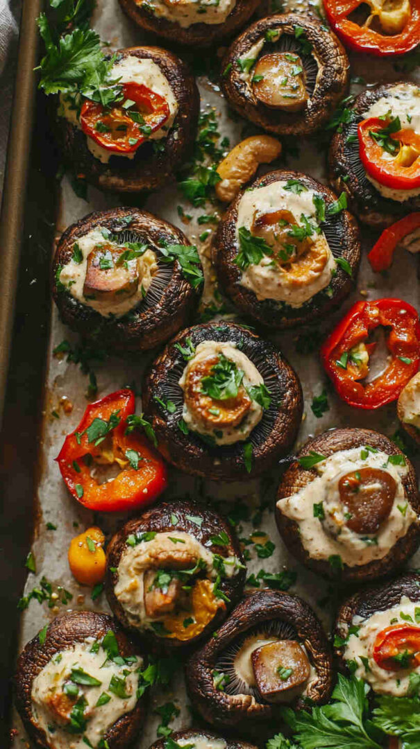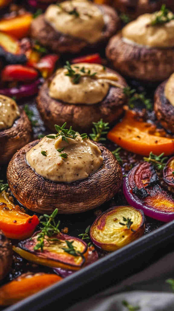 Indulge in hearty portobello or button mushrooms baked until juicy and golden, then generously coated in a rich, velvety cashew cream infused with garlic, herbs, and a touch of lemon. This plant-based dish delivers gourmet creaminess on a tight budget—perfect as a cozy main, side, or appetizer that’s naturally gluten-free and dairy-free.