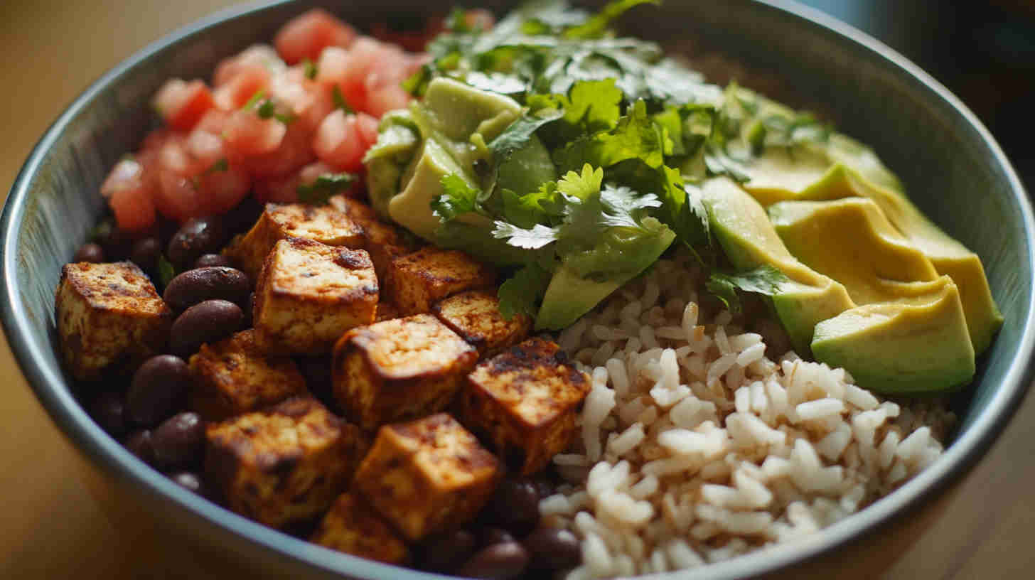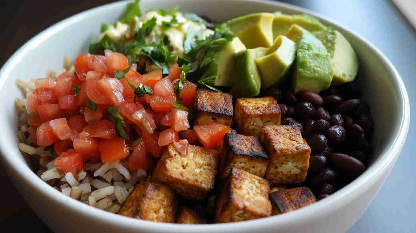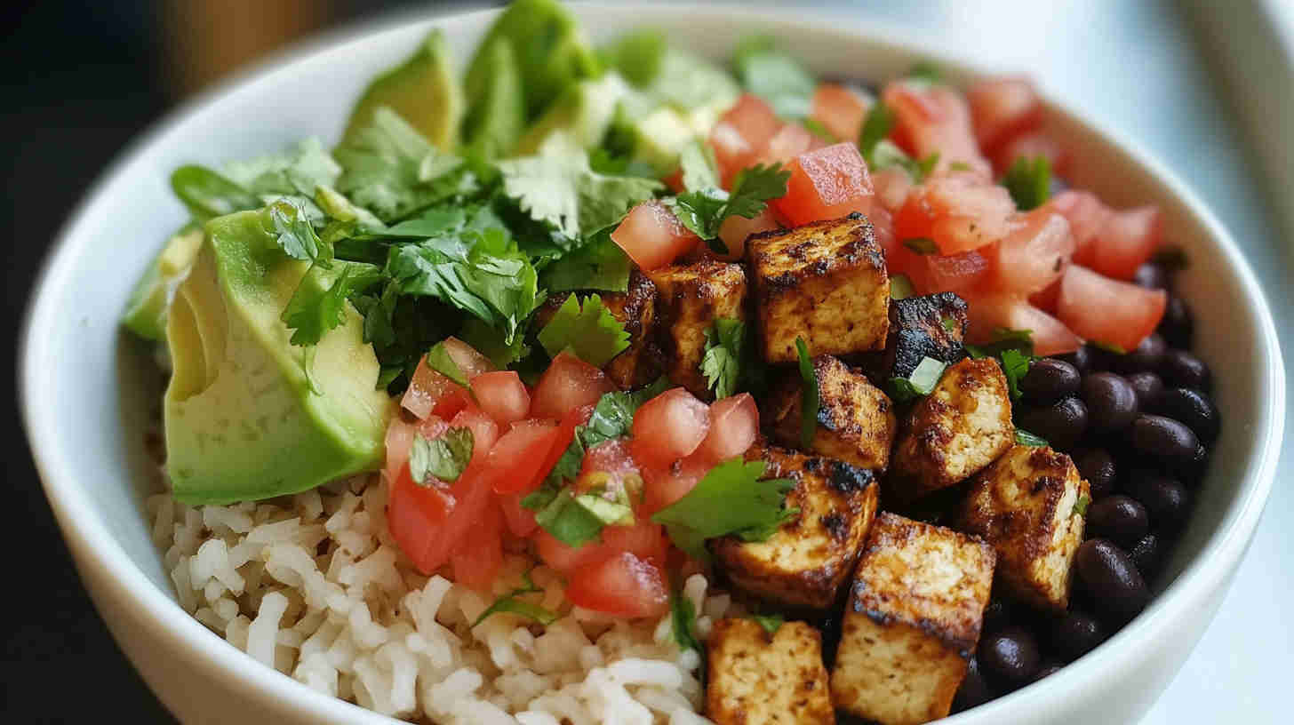 This Vegan High-Protein Burrito Bowl layers fluffy quinoa or cilantro-lime rice with spicy chipotle-seasoned black beans, crispy pan-fried tofu or tempeh, charred corn, fresh pico de gallo, creamy avocado, shredded cabbage, and a generous drizzle of cashew-lime crema. Packed with 30–40 g plant protein per bowl—colorful, filling and fiesta-ready.