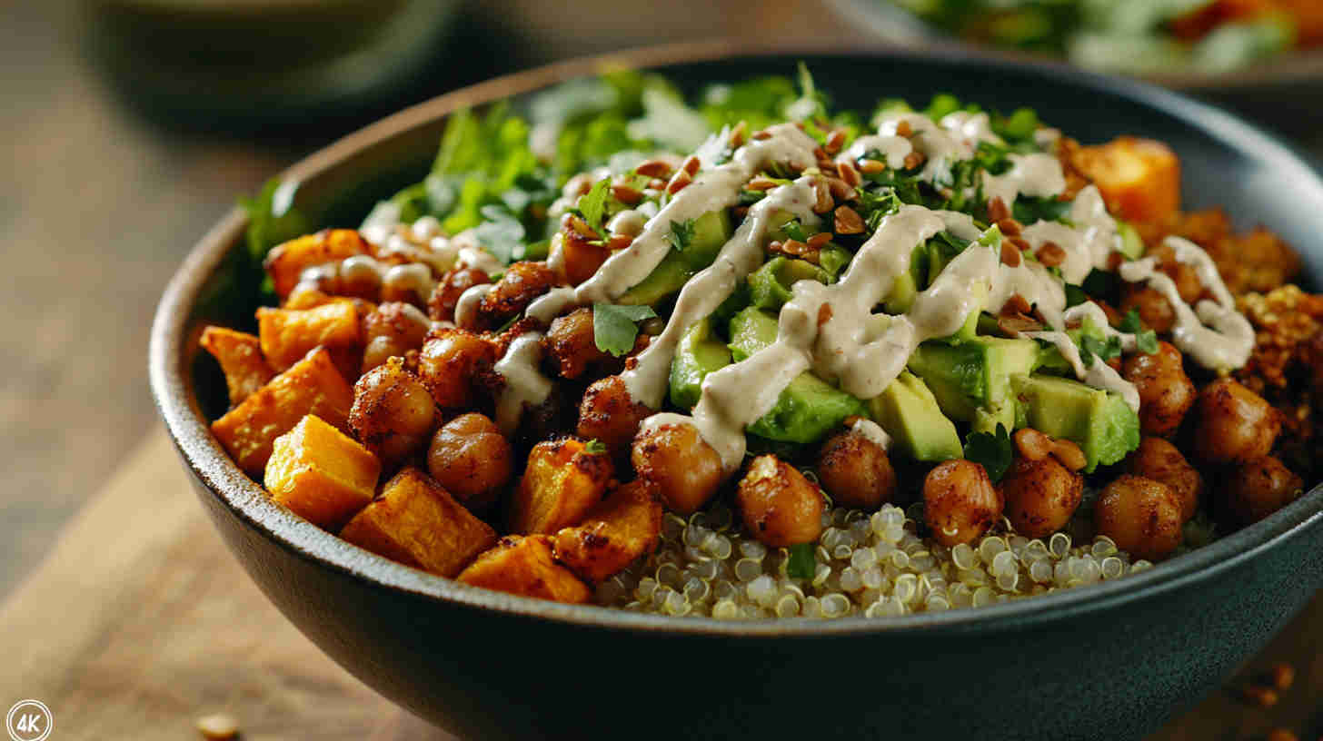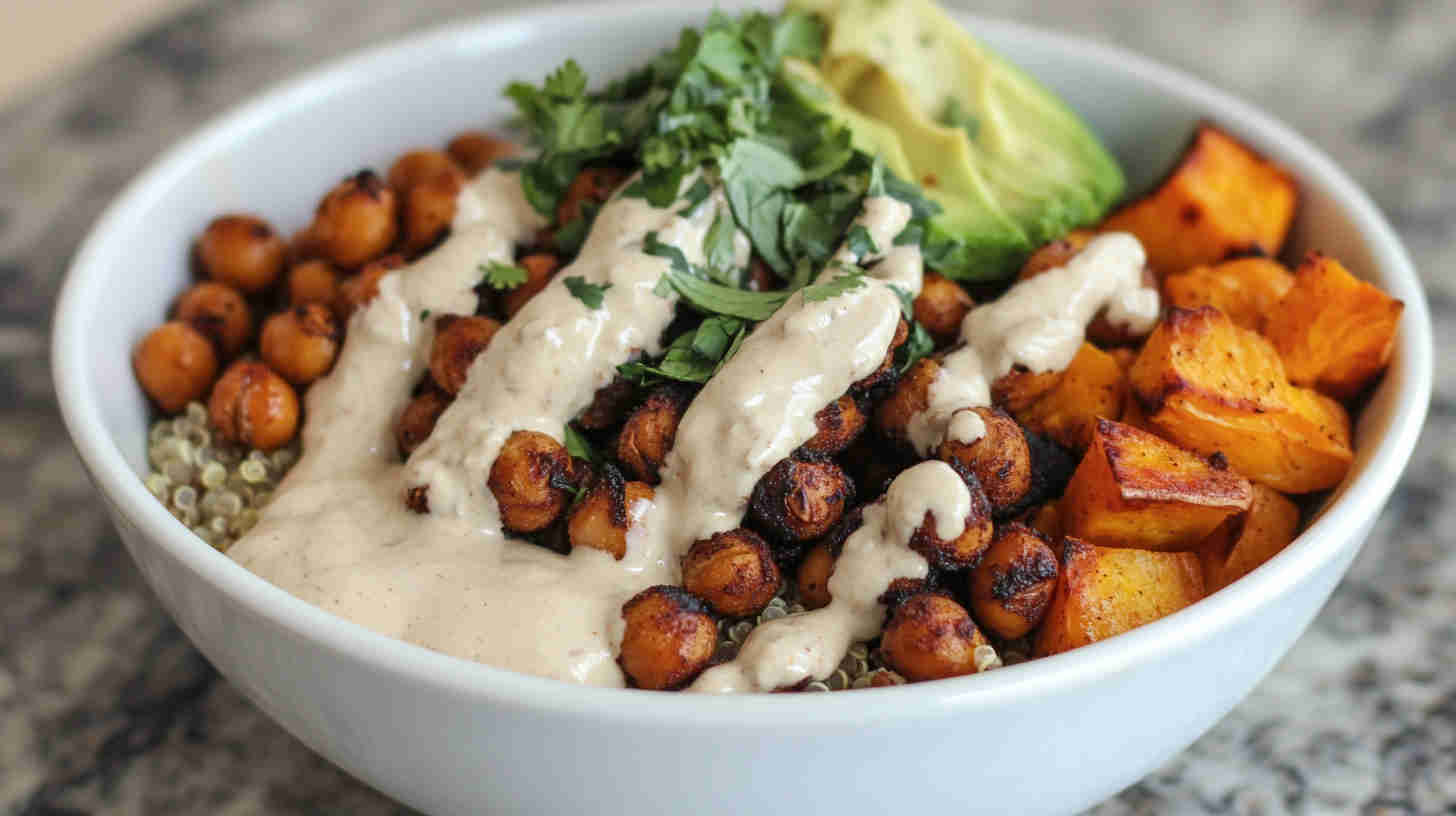 Avocado contributes creamy monounsaturated fats for satiety and heart health. Tahini (sesame paste) creates a rich, nutty sauce base full of calcium and healthy fats; fresh lemon juice brightens it while aiding iron absorption from plants. Garlic, cumin, paprika, and tamari/soy sauce layer umami without overwhelming the bowl.