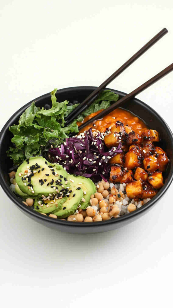 - Artfully arrange roasted sweet potatoes, crispy tofu, spiced chickpeas, edamame, sliced avocado, and greens on top—make it colorful and inviting; presentation boosts the appetite!