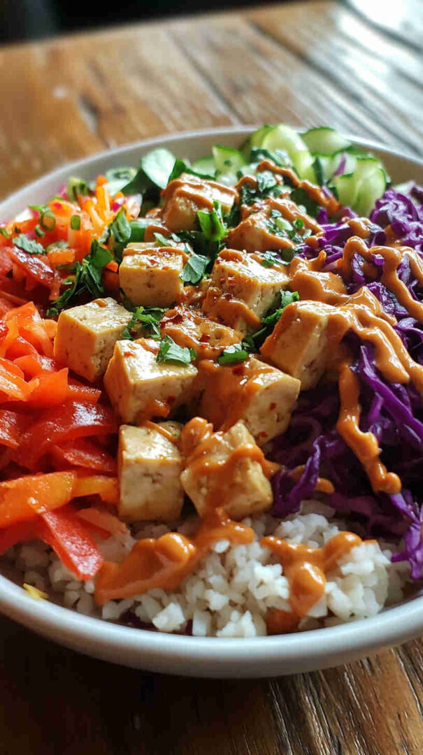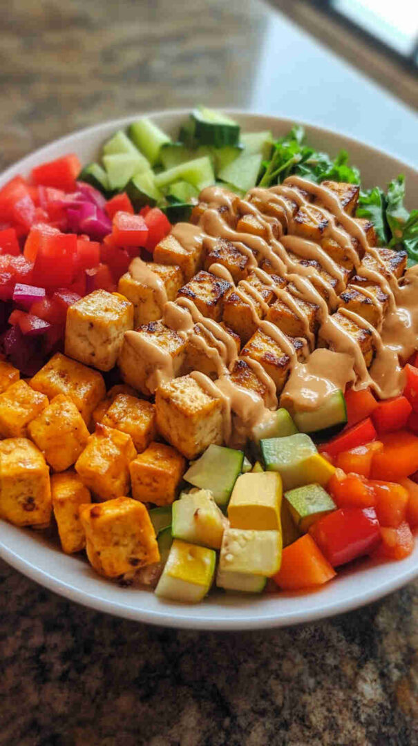 Add hemp seeds, pumpkin seeds, or nutritional yeast on top for bonus protein and B-vitamins. Make it spicy with sriracha or chili flakes in the sauce for a metabolism kick. Go Mexican-inspired with black beans, corn, salsa, and lime-cilantro dressing instead of tahini. For higher calories (bulking phase), double the avocado or add roasted nuts.