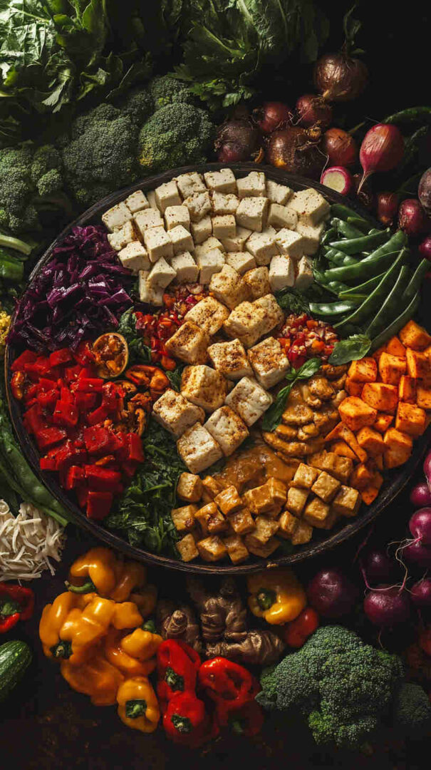 High-protein vegan Buddha bowl with tofu, quinoa, sweet potatoes, chickpeas—perfect fuel for powerlifting gains!