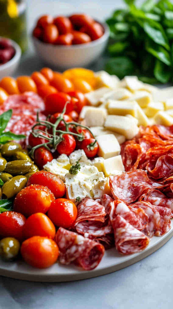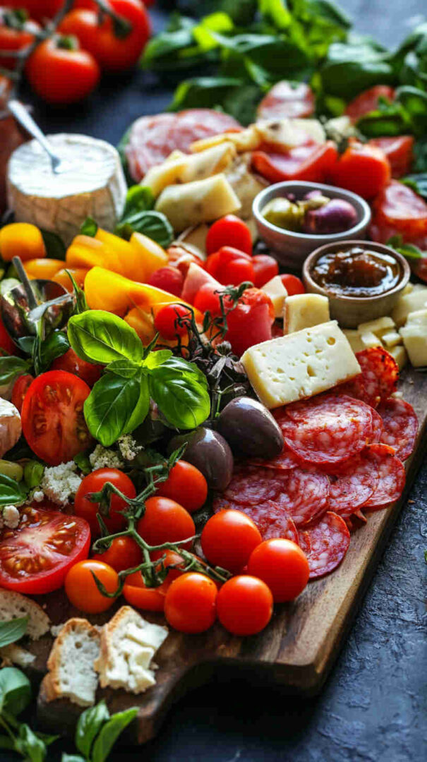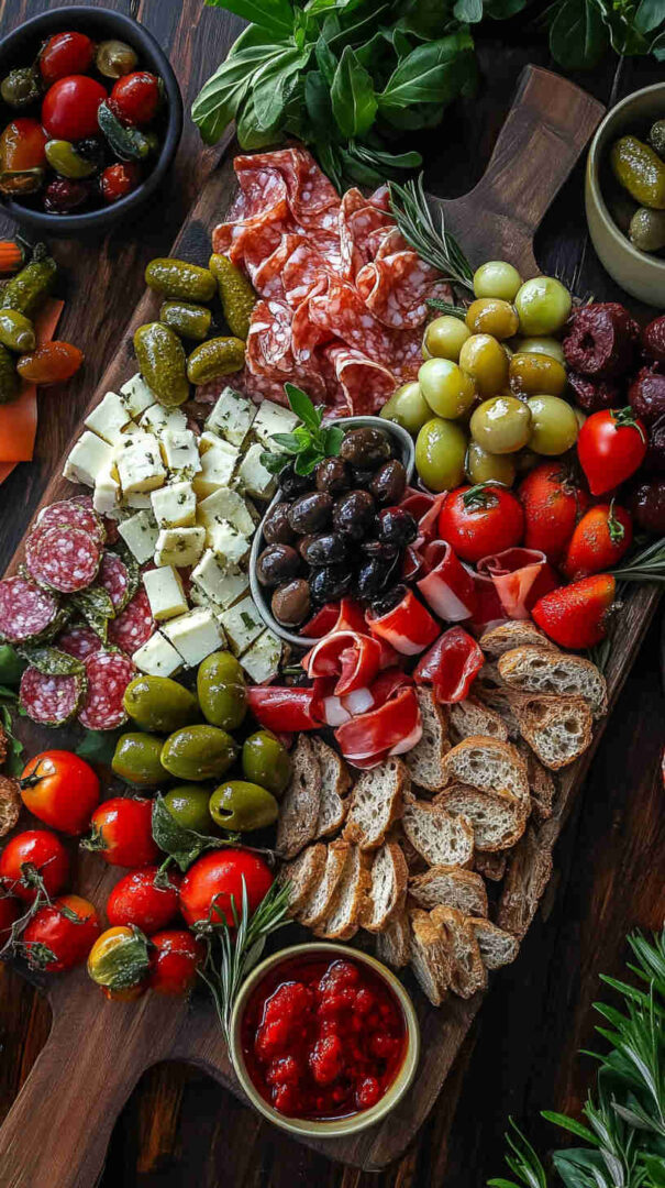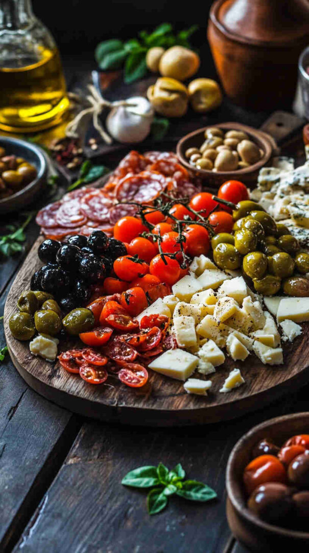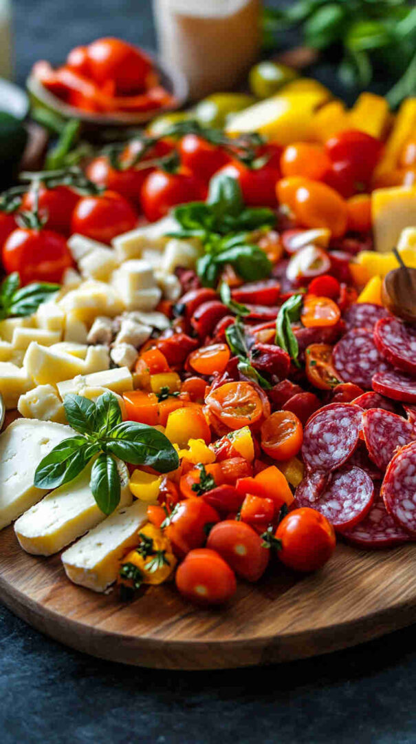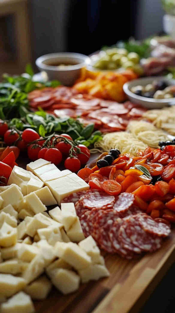 Marinated vegetables (artichoke hearts, roasted red/yellow peppers, pepperoncini) deliver tangy acidity and smokiness straight from the jar. Olives (mild Castelvetrano green and bold Kalamata black) add essential brininess. Sun-dried tomatoes (oil-packed) bring concentrated sweetness and chew.