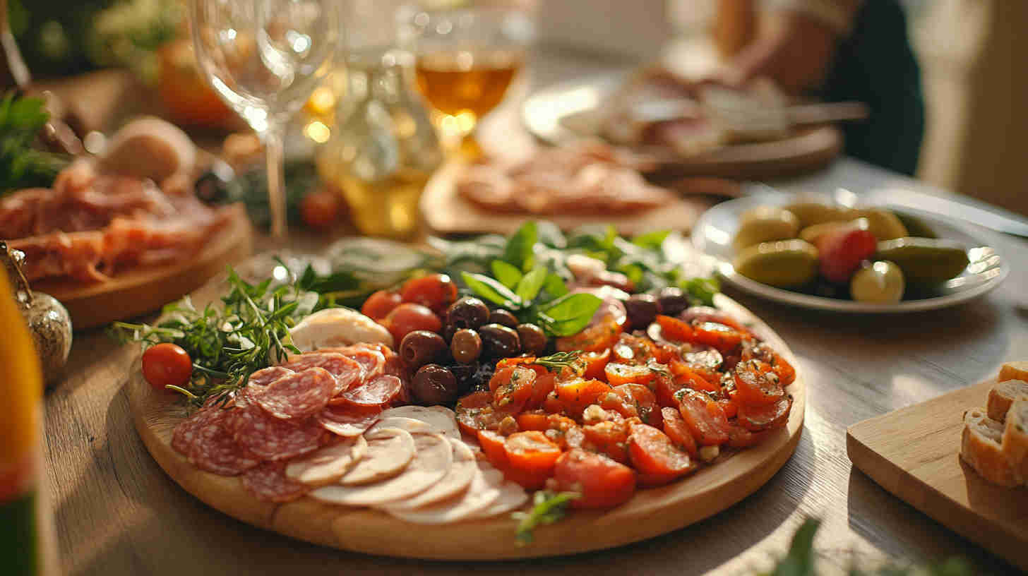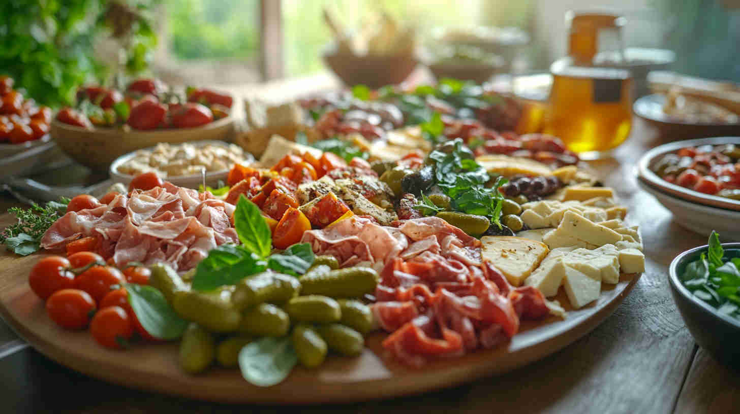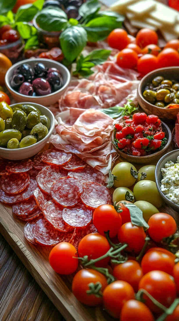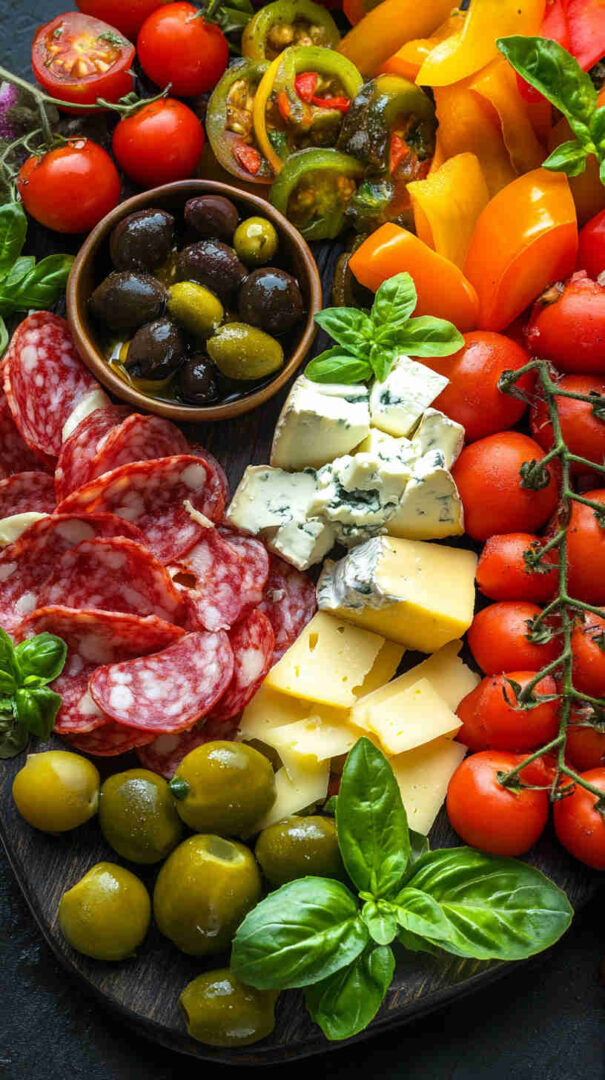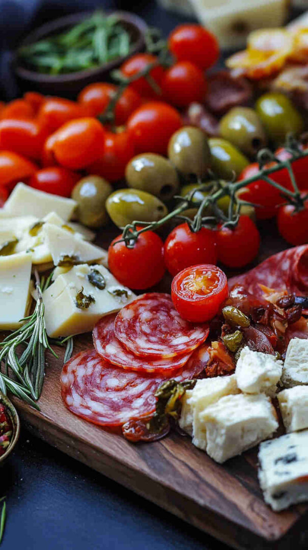 Marinated vegetables (artichoke hearts, roasted red/yellow peppers, pepperoncini) deliver tangy acidity and smokiness straight from the jar. Olives (mild Castelvetrano green and bold Kalamata black) add essential brininess. Sun-dried tomatoes (oil-packed) bring concentrated sweetness and chew.