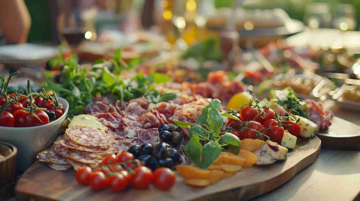 Select high-quality cheeses and jarred marinated items from Italian brands for authentic taste. Arrange in color-blocked sections or fan shapes for visual drama—place salty items apart from delicate fruits to avoid flavor bleed.