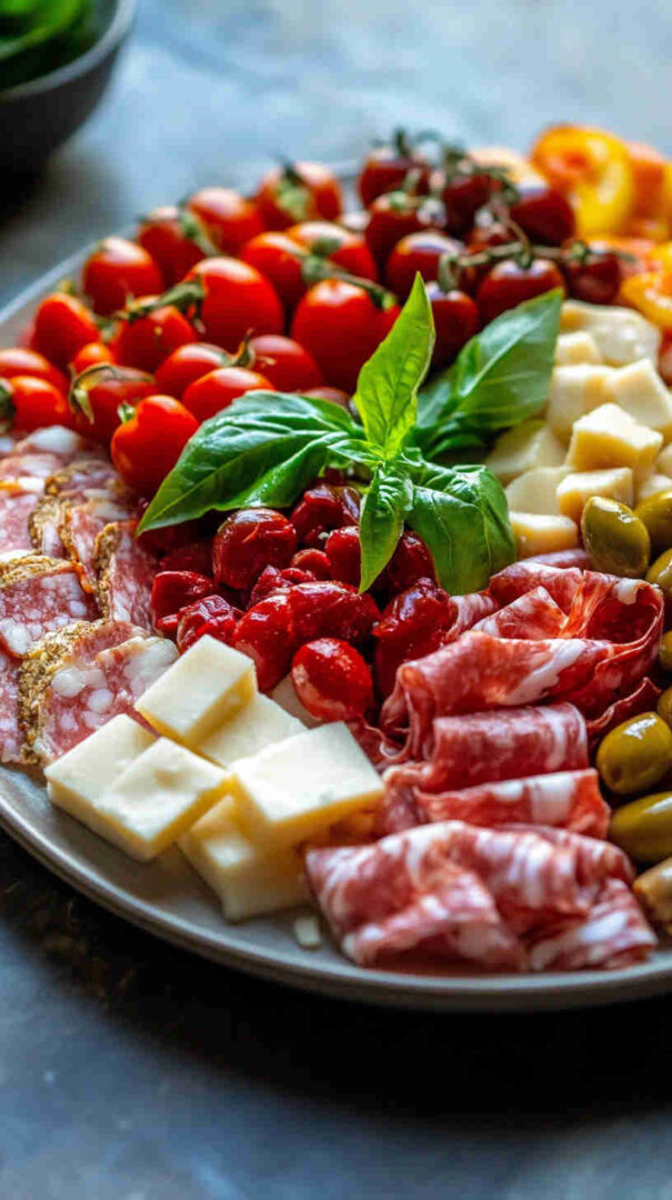 A Vegetarian Italian Antipasto Platter is a stunning, no-cook assortment of creamy cheeses (mozzarella, provolone, Parmigiano), briny olives, tangy marinated artichokes and roasted peppers, sun-dried tomatoes, fresh cherry tomatoes, crisp veggies, nuts, seasonal fruits, and crusty bread or grissini—all drizzled with extra virgin olive oil and scattered with fresh herbs for an elegant, shareable Italian starter full of Mediterranean flavors.