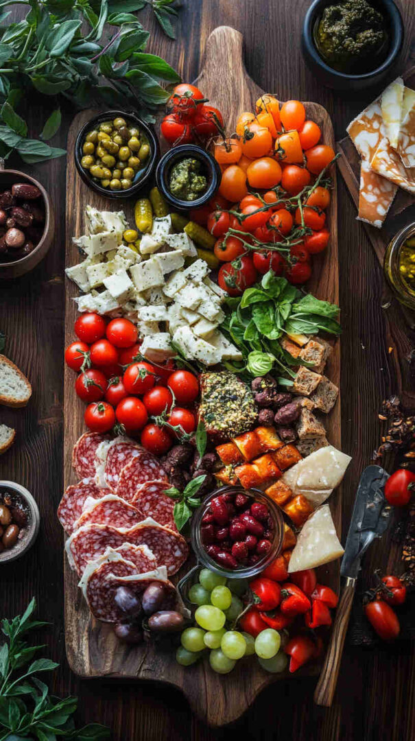 The combination of creamy cheeses, tangy marinated vegetables, salty olives, sweet fruits, and crunchy nuts creates an irresistible harmony: every bite offers contrast and balance, from silky mozzarella to crisp grissini, briny olives to juicy grapes.
