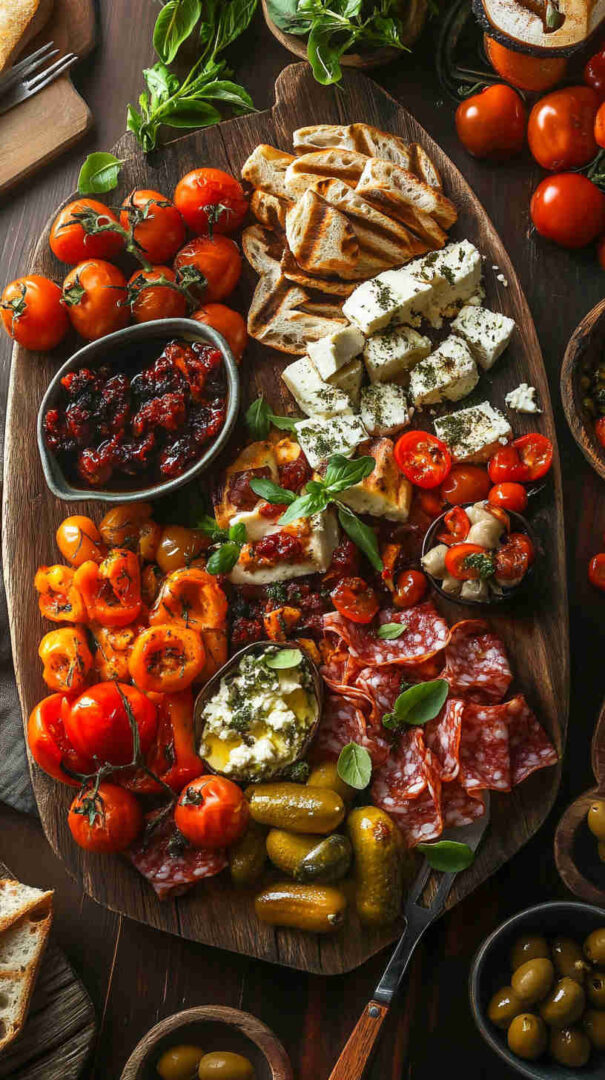Tailor it endlessly! Add marinated mushrooms, grilled eggplant or zucchini slices, or giardiniera for more veggie variety. Include a creamy dip like white bean spread, hummus, or pesto for scooping.