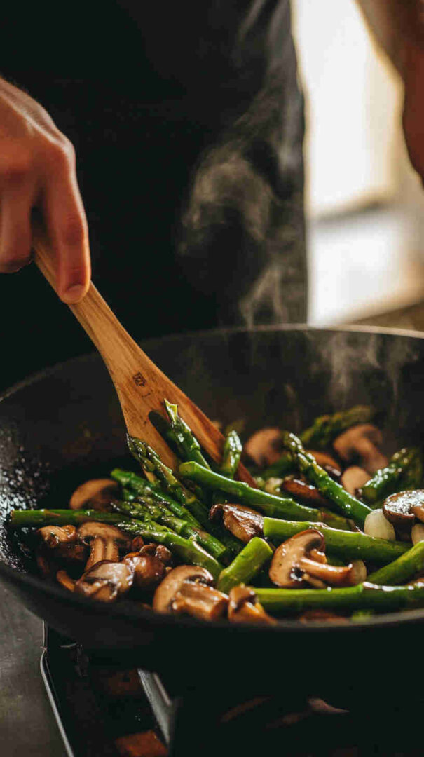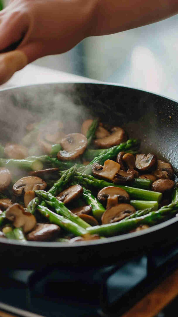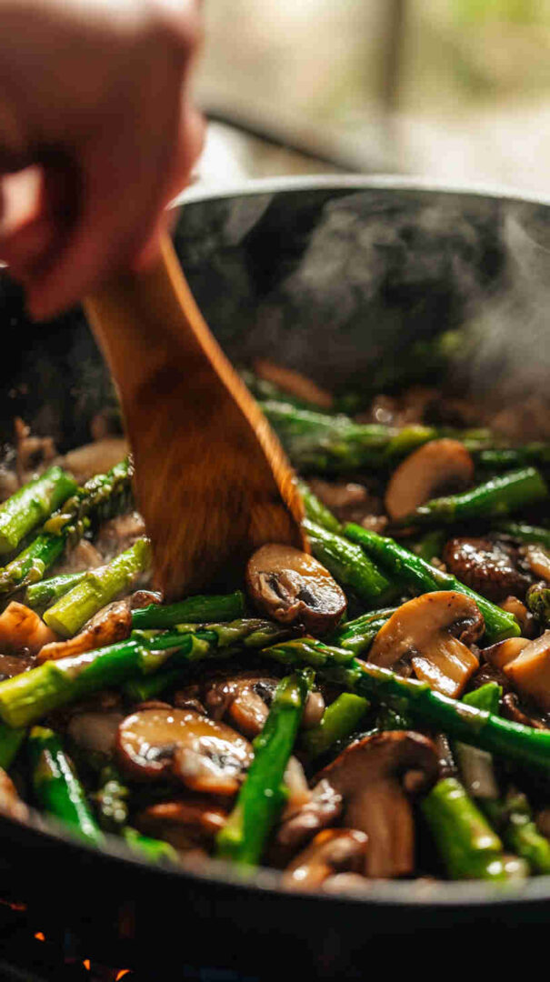 Use a very large skillet (12–14 inch) or cook mushrooms in batches so they brown instead of steam—patience here is key for flavor. Don’t overcrowd the asparagus either—give it space to char slightly.