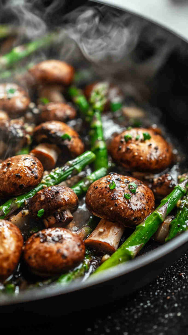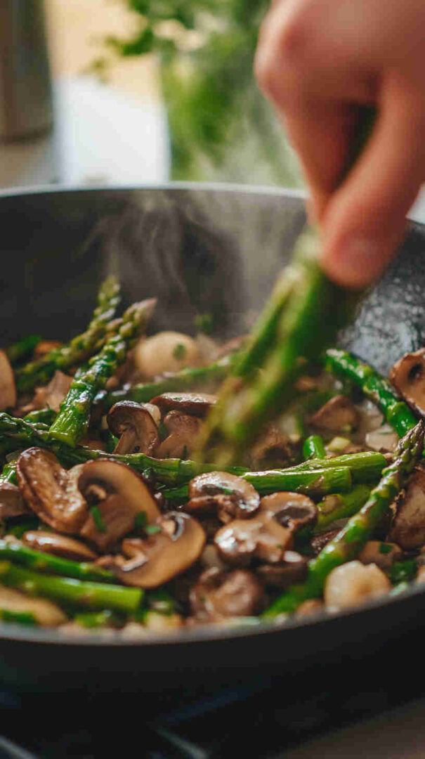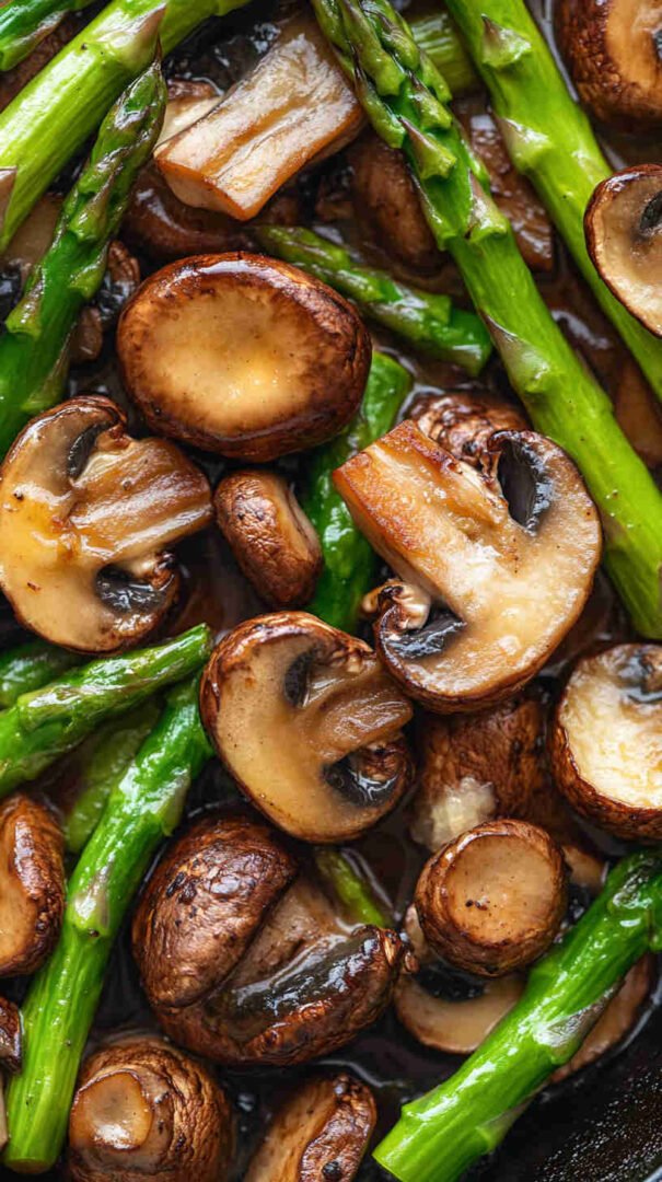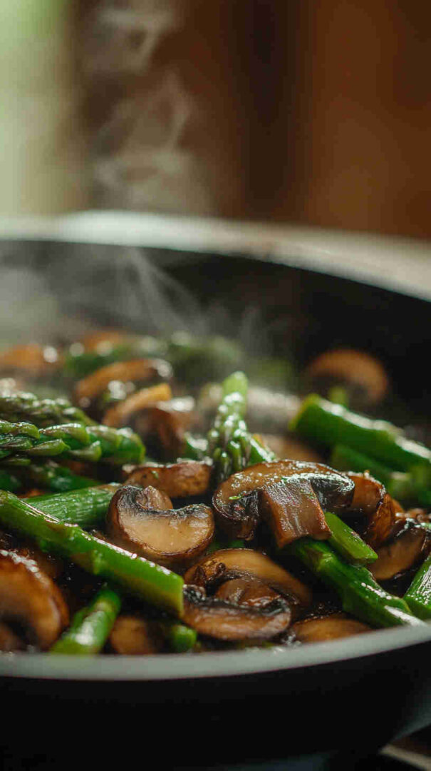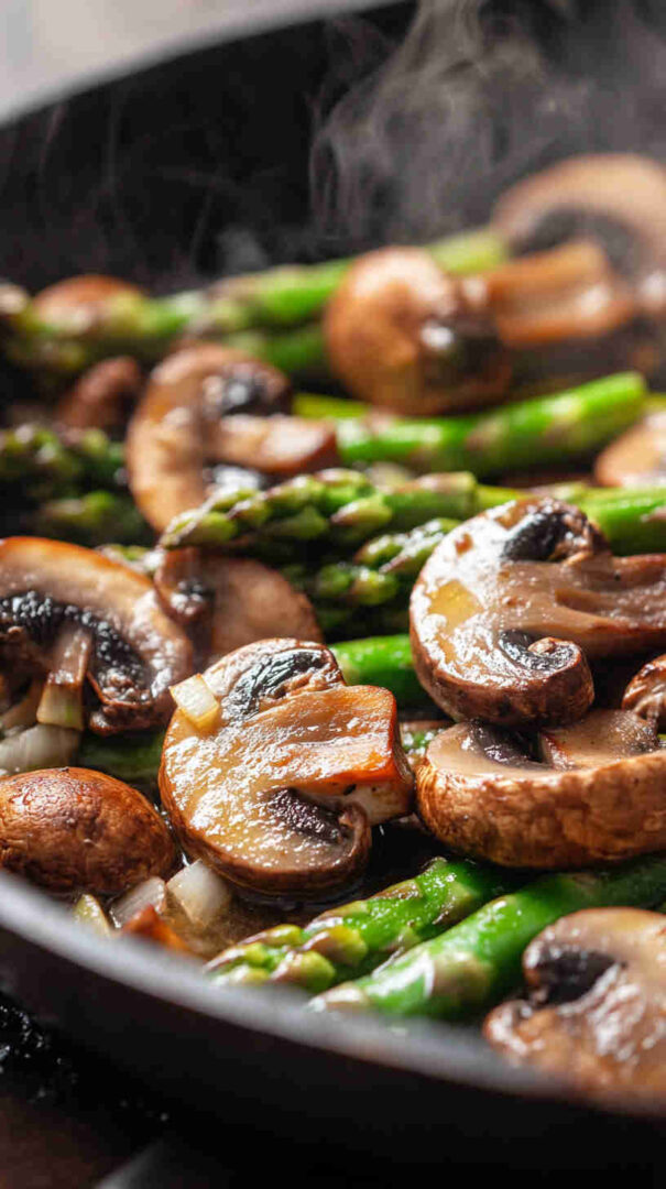 Best enjoyed fresh while asparagus is crisp and mushrooms are golden. Refrigerate leftovers in an airtight container for up to 3 days. Reheat gently in a skillet over medium-low heat with a splash of water or broth to loosen and revive texture (microwaving makes asparagus soggy).