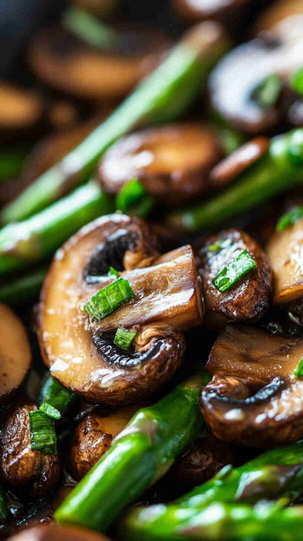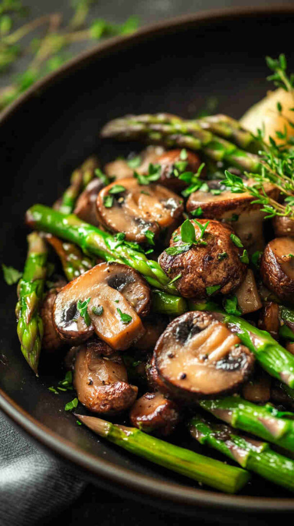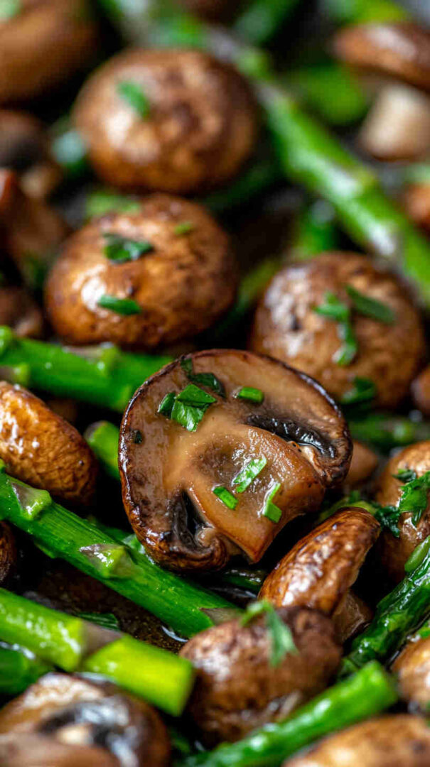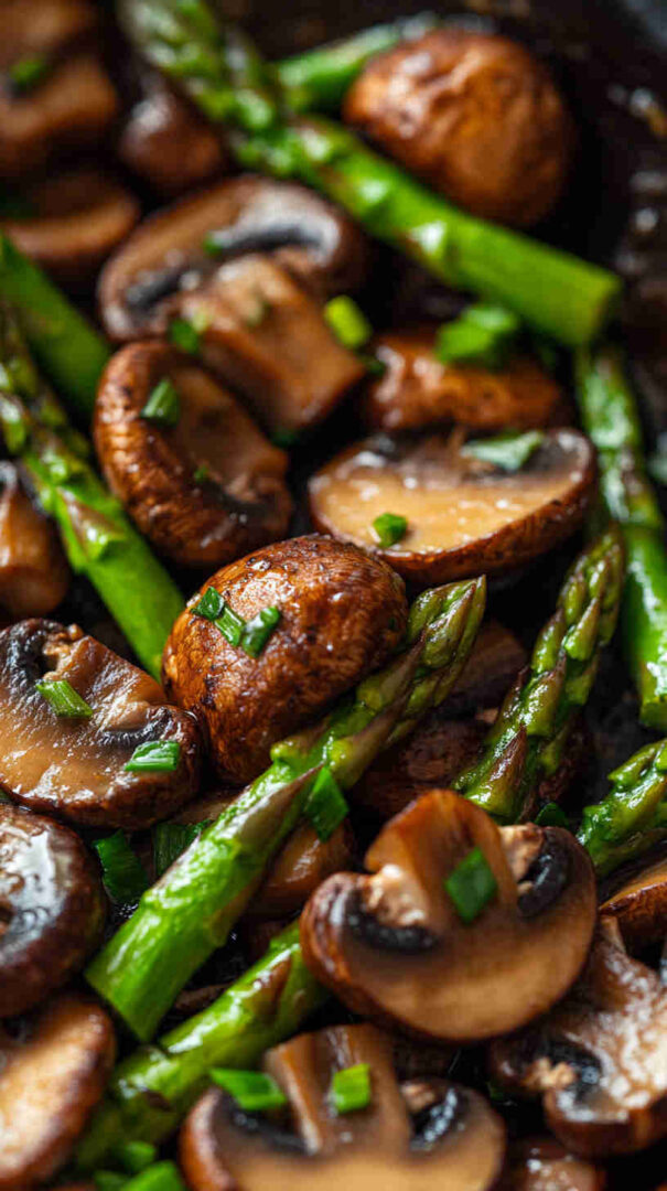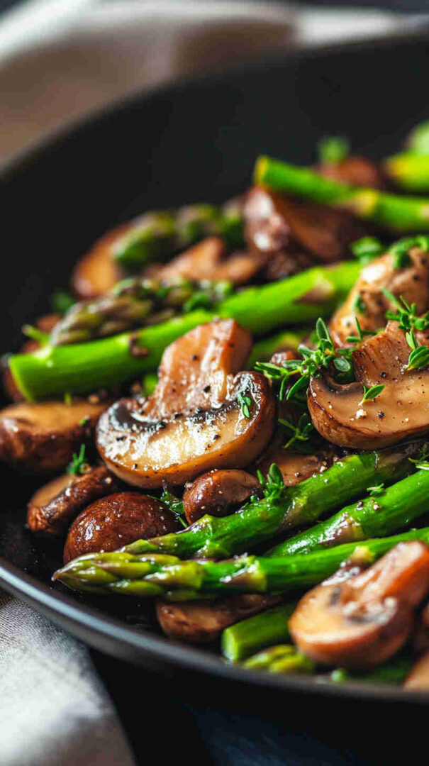 Best enjoyed fresh while asparagus is crisp and mushrooms are golden. Refrigerate leftovers in an airtight container for up to 3 days. Reheat gently in a skillet over medium-low heat with a splash of water or broth to loosen and revive texture (microwaving makes asparagus soggy).