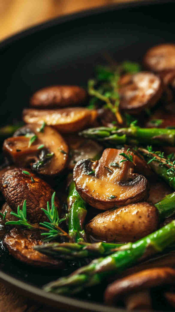 Golden mushrooms & crisp asparagus in garlicky lemon-thyme skillet—fresh, fast, elegant vegetarian delight!
