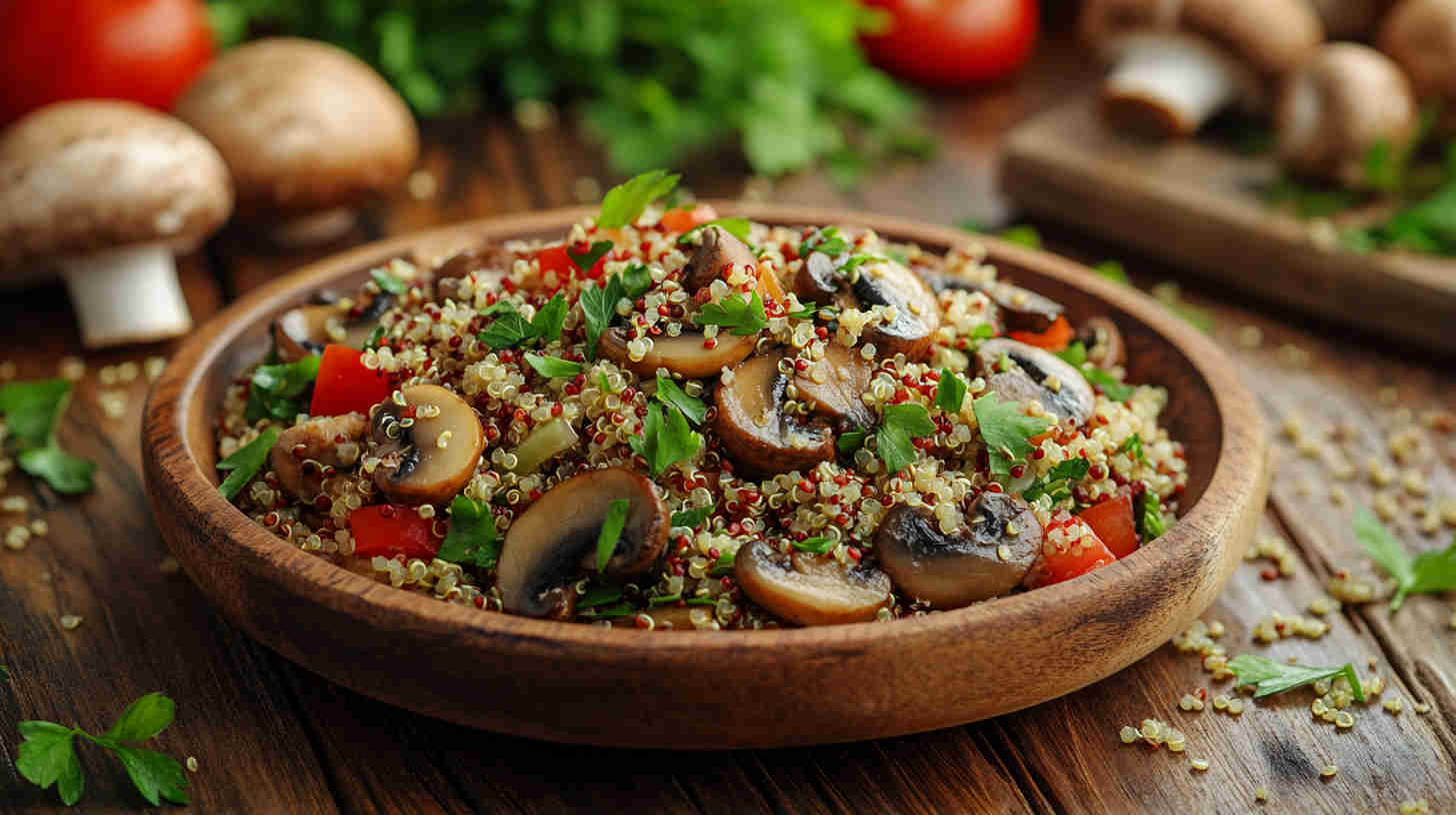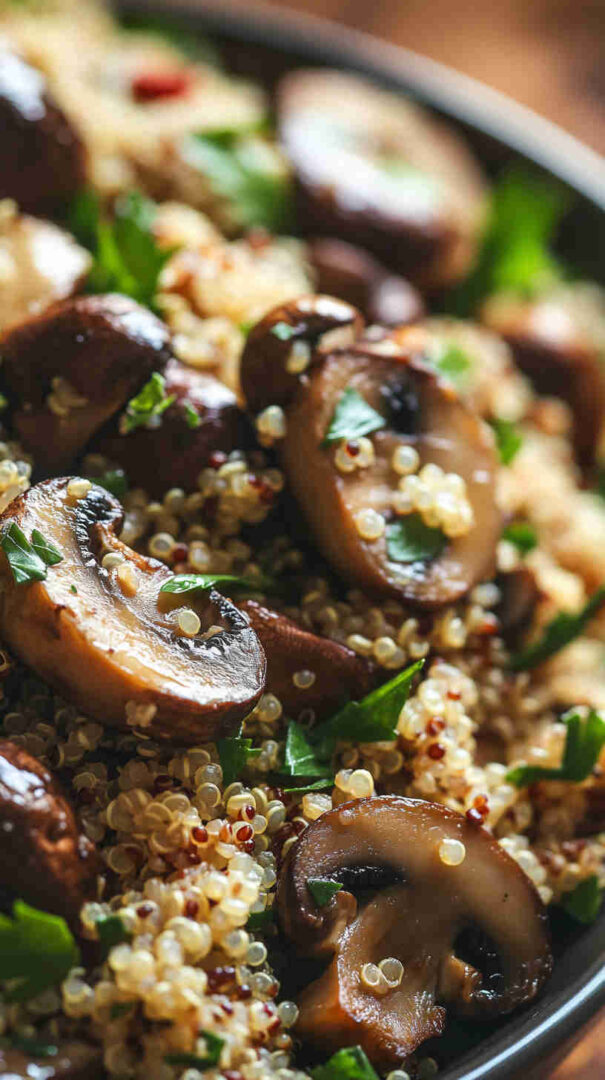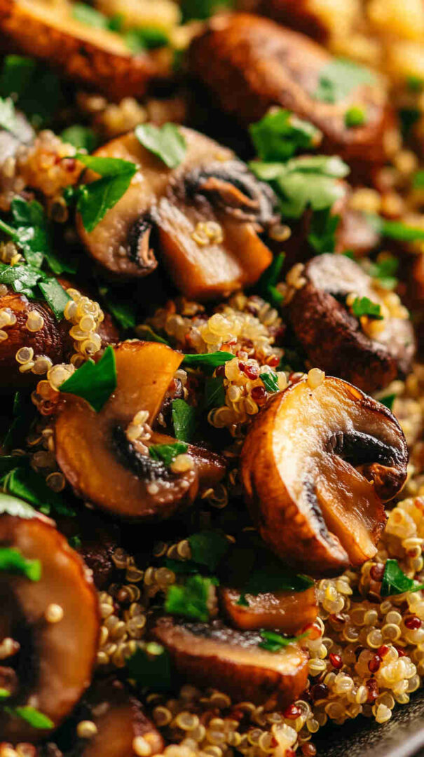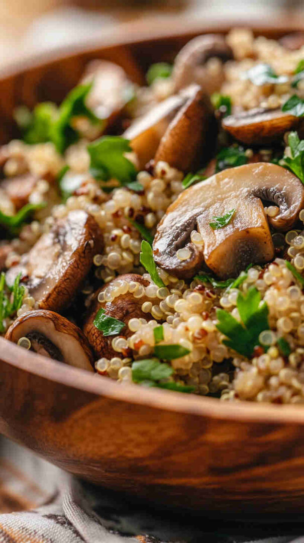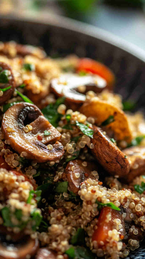 Rinse quinoa thoroughly before cooking to remove its natural bitter coating (saponins). Toast quinoa in a dry pan for 1–2 minutes before boiling for deeper nutty flavour. Let mushrooms brown properly with space in the pan—don’t overcrowd or they’ll steam instead of caramelise.